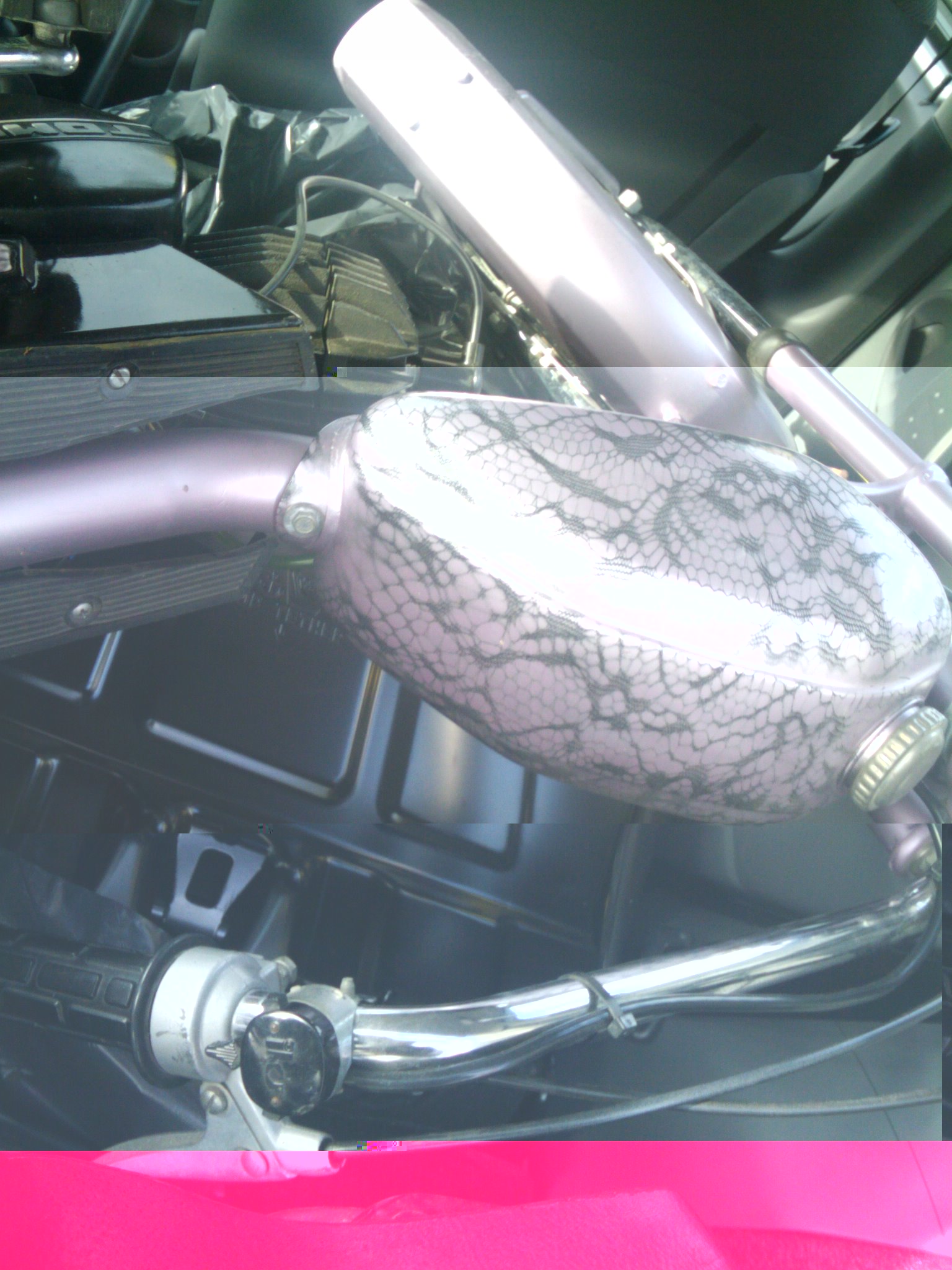 Die zelfde dag meteen alles uit elkaar gehaald, geschuurd en gespoten. Dit is het 'wazige' eindresultaat: Zoals je ziet, had ik geen verf meer voor de koplamp.. dus die moet nog een keer gespoten worden.