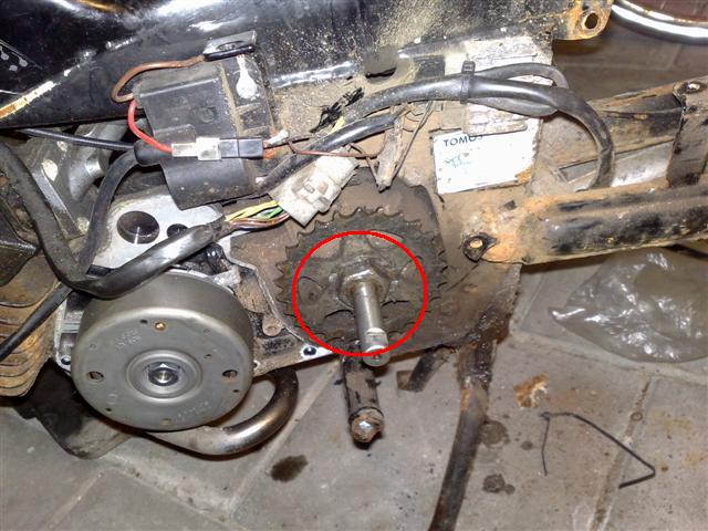 De kickstart veer moet in het carter achter het ijzer blijven hangen, en in het kickstartbeugeltje in een gaatje vallen. Dan draai je zover rechtsom, dat je de kickstart erop kan zetten en de spie er in kan drukken, over de vlakke kant van de kickstartas zodat de spie aan de voorkant van de beugel komt die de kickstart tegenhoudt. Die vlakke kant van de as kan je het beste naar de voorkant zetten, voordat je het beugeltje erop zet.