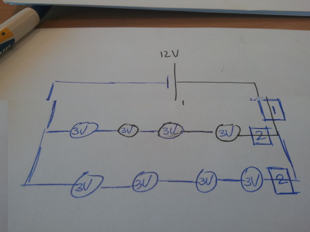 Ik dacht goed bezig te zijn, ik vond een accu van precies twaalf volt (stond erop). Dus ik snel in mijn hoofd berekend 3volt x 4 leds=12 volt, precies! Ik had toen die ledjes 2 keer 4 ledjes in serie gezet en op de accu aangesloten, ze werkte!