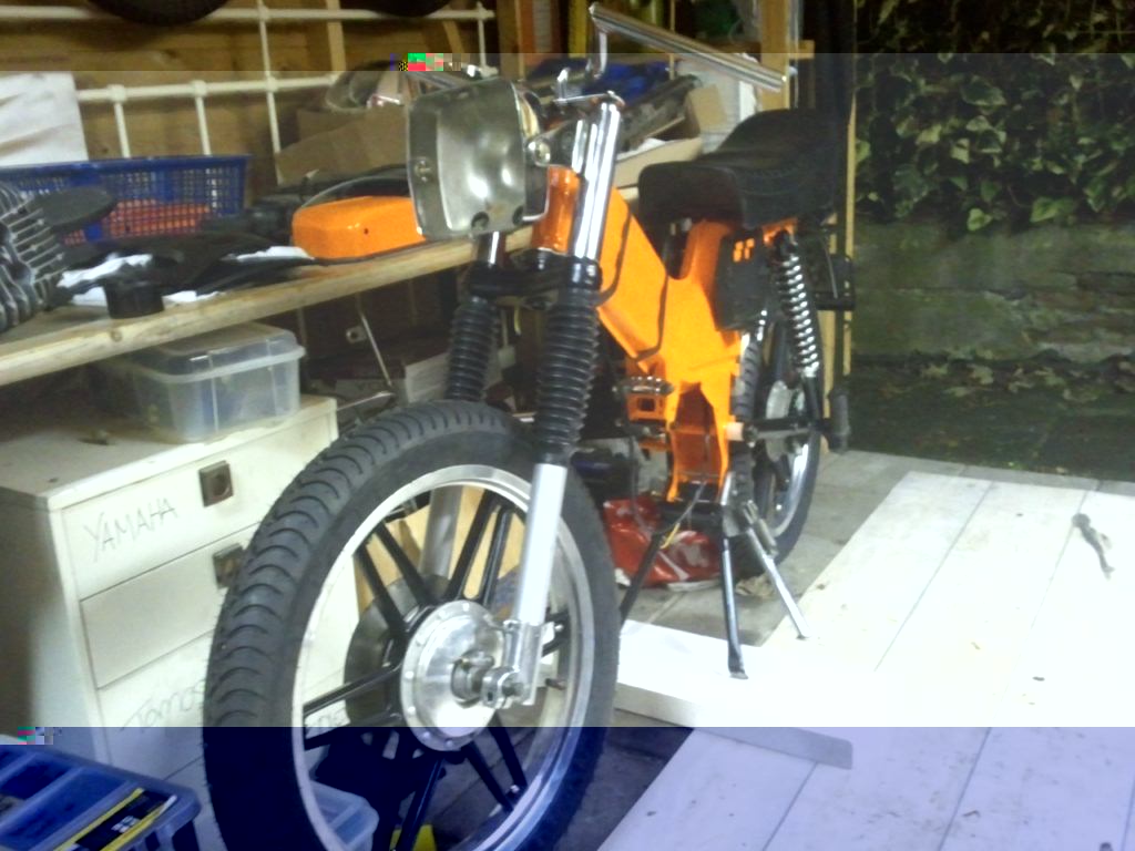 Voorvork heb ik gereviseerd volgens het boekje en in theorie zou deze nu weer gewoon goed moeten veren.. alleen toen ik hem van de tafel afhaalde en op de grond zette veerde 'ie maar heel weinig tot niet.. Ook had ik een, volgens de verkoper, een zgan standaard gekocht en nu deze gemonteerd is lijkt de standaard wel doorgezakt te zijn.. Ik ga kijken of ik nog kan achterhalen van wie ik deze heb gekocht Ook had ik opnieuw verchroomde spatbordbeugels gekocht alleen heeft hij mij de verkeerde toegestuurd en gaat dat ook weer lang duren.. Spullen van KP zijn ook nog niet binnen..