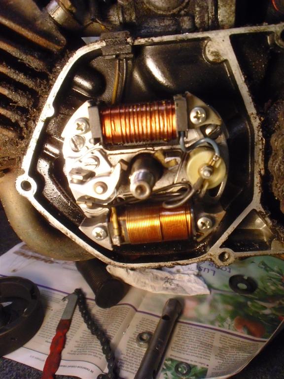 Punten kun je ook iets opschuren met waterproof schuurpapier als je deze er tussendoor haalt. Misschien kan de condensator (dat ronde tonnetje rechts op de foto) lek zijn. Bobine staat denk ik ook op de carterdeksel, misschien maakt die wat slecht massa. Probeer eens een draadje te leggen van de buitenkant van de bobine (ijzeren deel) naar het frame op een schroef. Soms werkt de ontsteking dan wel weer. Eventueel een stukje van de bougiekabel afknippen als deze wat is gecorrodeerd of geen goed contact meer maakt in de dop of op de bobine. De aansluitingen daarvan zijn wel nog goed of is dat ook weggebrand?