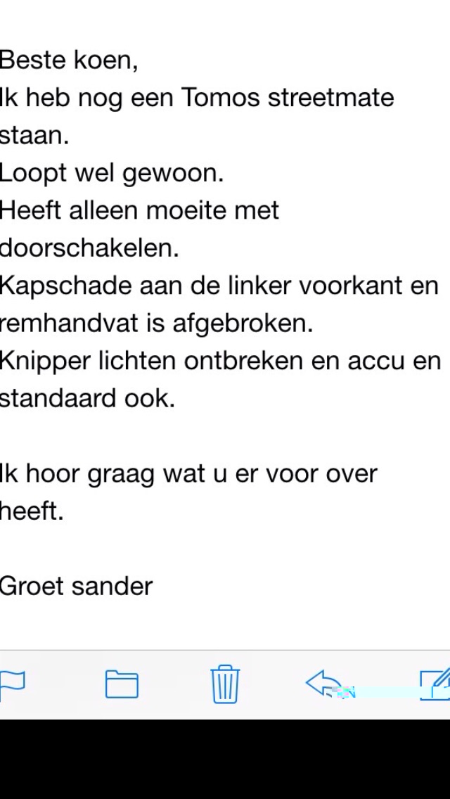 Ik ben al bij de brommerboer geweest, want heb zelf twee linker handen. De reparatie zou mij 100 tot 150 euro gaan kosten. Nu heb ik dit er niet voor over, mocht het echt een gedoe zijn gaat de Tomos gewoon de verkoop in.