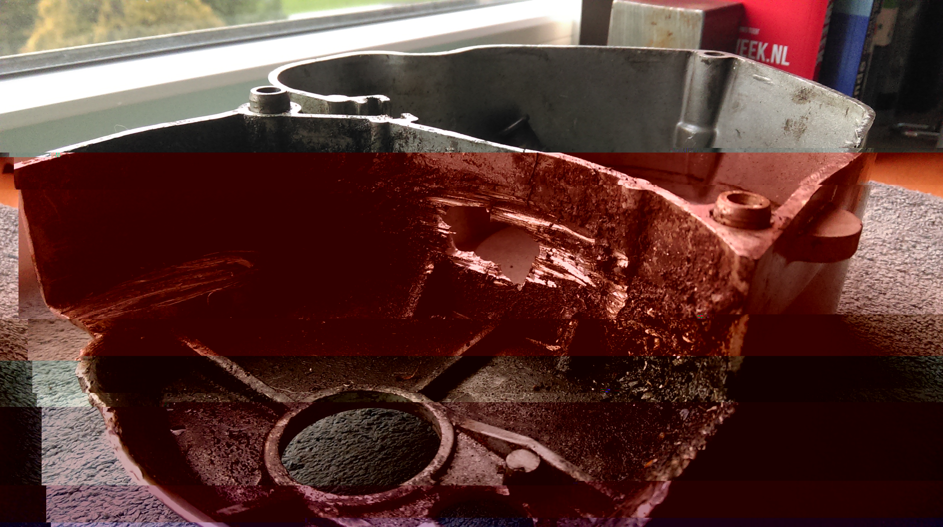 De carterdelen al terug, ziet er weer gelikt uit. Alle gietpuntjes en rafels in het carter gladgeschuurd met hele lichte korrel, nu ze open liggen is het die tien minuten werk wel waard. Heb ik straks weer een blokje onder mijn kont waarvan ik zeker ben dat alles goed is.