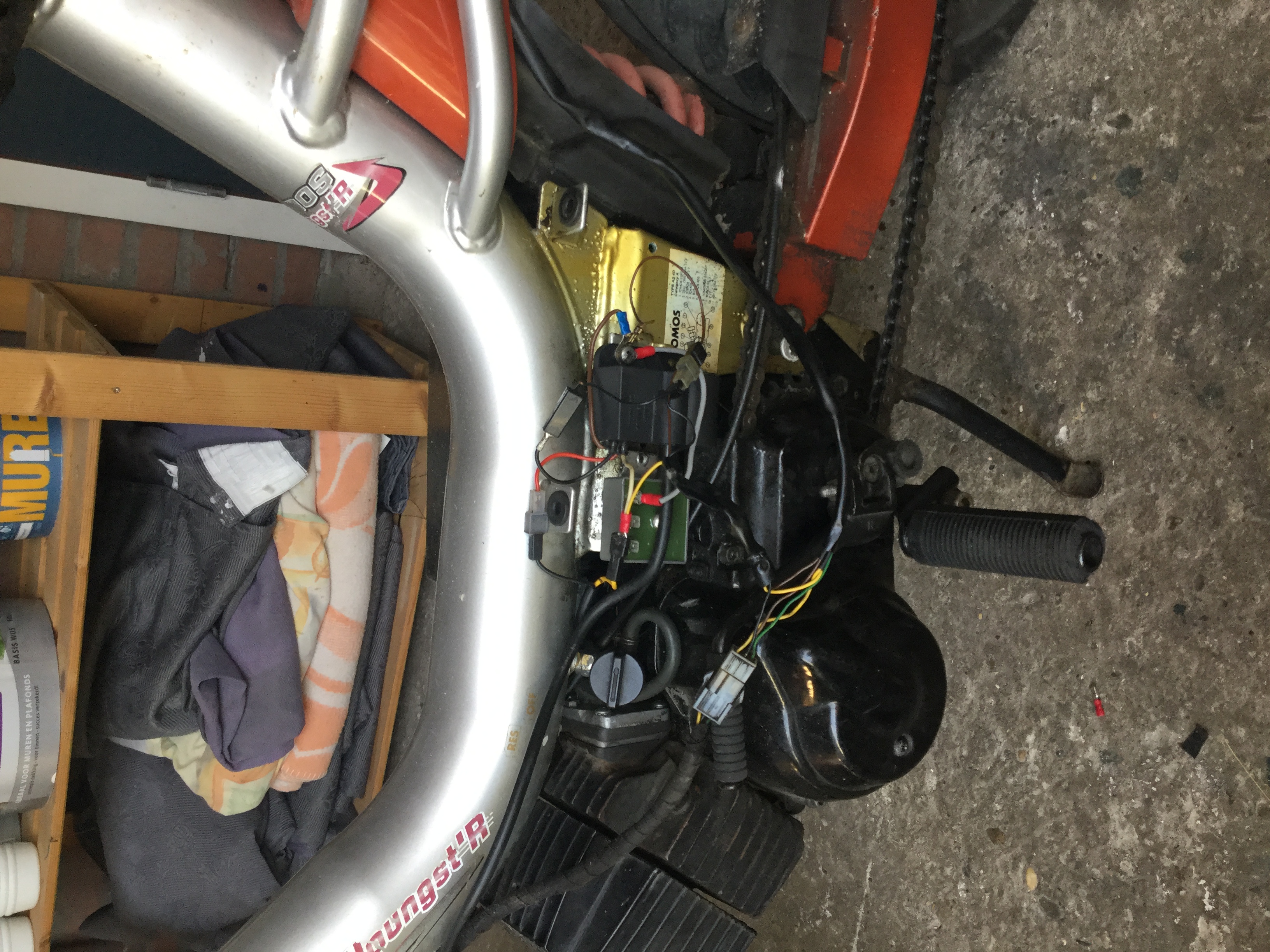 Zoals je wel kan zien is de is de vorige eigenaar zelf wat aan het prutsen geweest. Heb het idee dat de er ook een type CDI gemonteerd is wat er niet op hoeft te zitten.