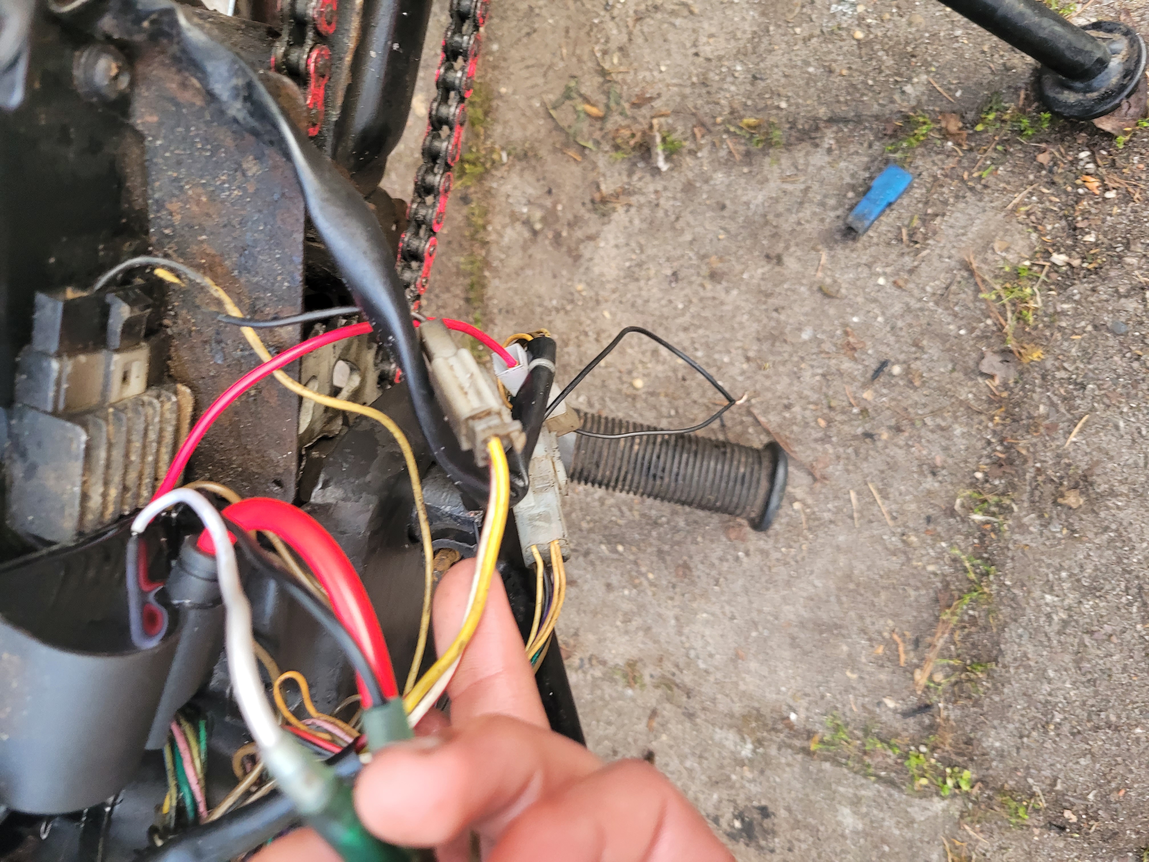 Wel zie ik dat er een kabeltje los hangt. Ik weet niet waar die aan gemonteert zou moeten worden. Er zijn sowieso losse kabels. Want het blok ondersteunt e-start. Maar die is niet aangesloten. Dus alleen kicken. Als iemand raad weet. Heel graag en alvast bedankt.
