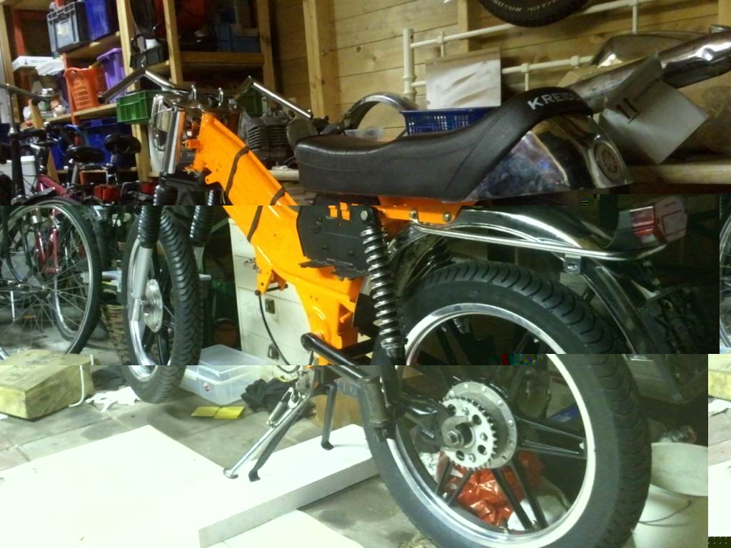 Voorvork heb ik gereviseerd volgens het boekje en in theorie zou deze nu weer gewoon goed moeten veren.. alleen toen ik hem van de tafel afhaalde en op de grond zette veerde 'ie maar heel weinig tot niet.. Ook had ik een, volgens de verkoper, een zgan standaard gekocht en nu deze gemonteerd is lijkt de standaard wel doorgezakt te zijn.. Ik ga kijken of ik nog kan achterhalen van wie ik deze heb gekocht Ook had ik opnieuw verchroomde spatbordbeugels gekocht alleen heeft hij mij de verkeerde toegestuurd en gaat dat ook weer lang duren.. Spullen van KP zijn ook nog niet binnen..