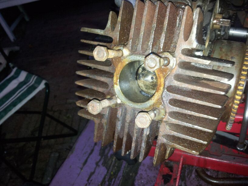 Vandaag weer een hele tijd gezweet en gevloekt op de cilinder. Niet eraf te krijgen, onmogelijk. Heet gestookt, gehamerd, gewrikt, gesmeerd. Echt GEEN MM beweging. Ook met hulp van mijn vader, een vriend en een breekijzer is het niet los te krijgen. En geloof me, dan wordt er kracht gezet. Dus een koelrib gebroken en een stukje carter :roll: