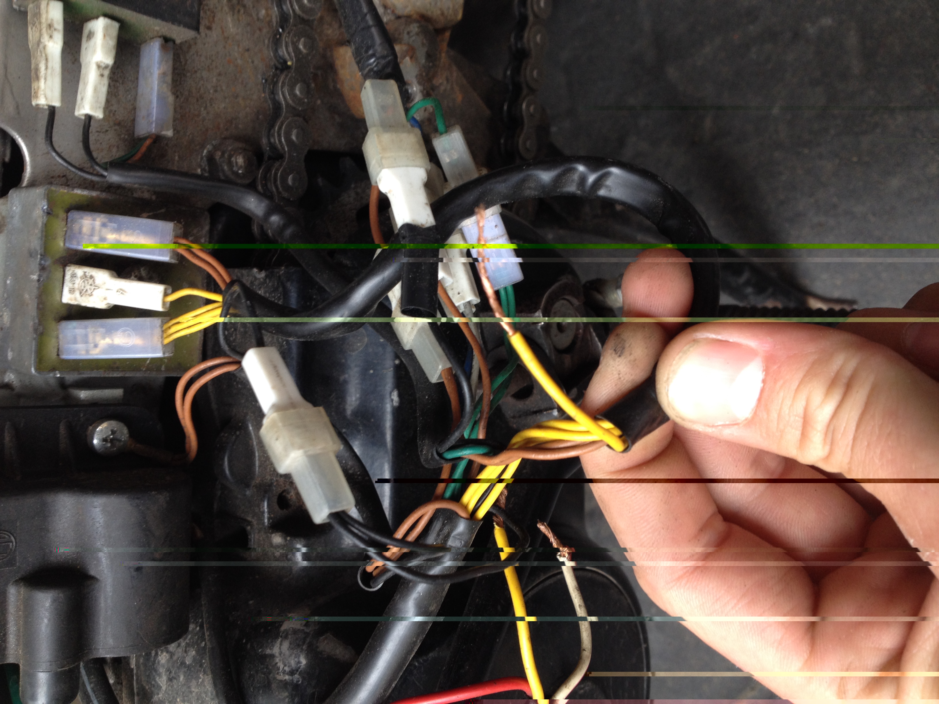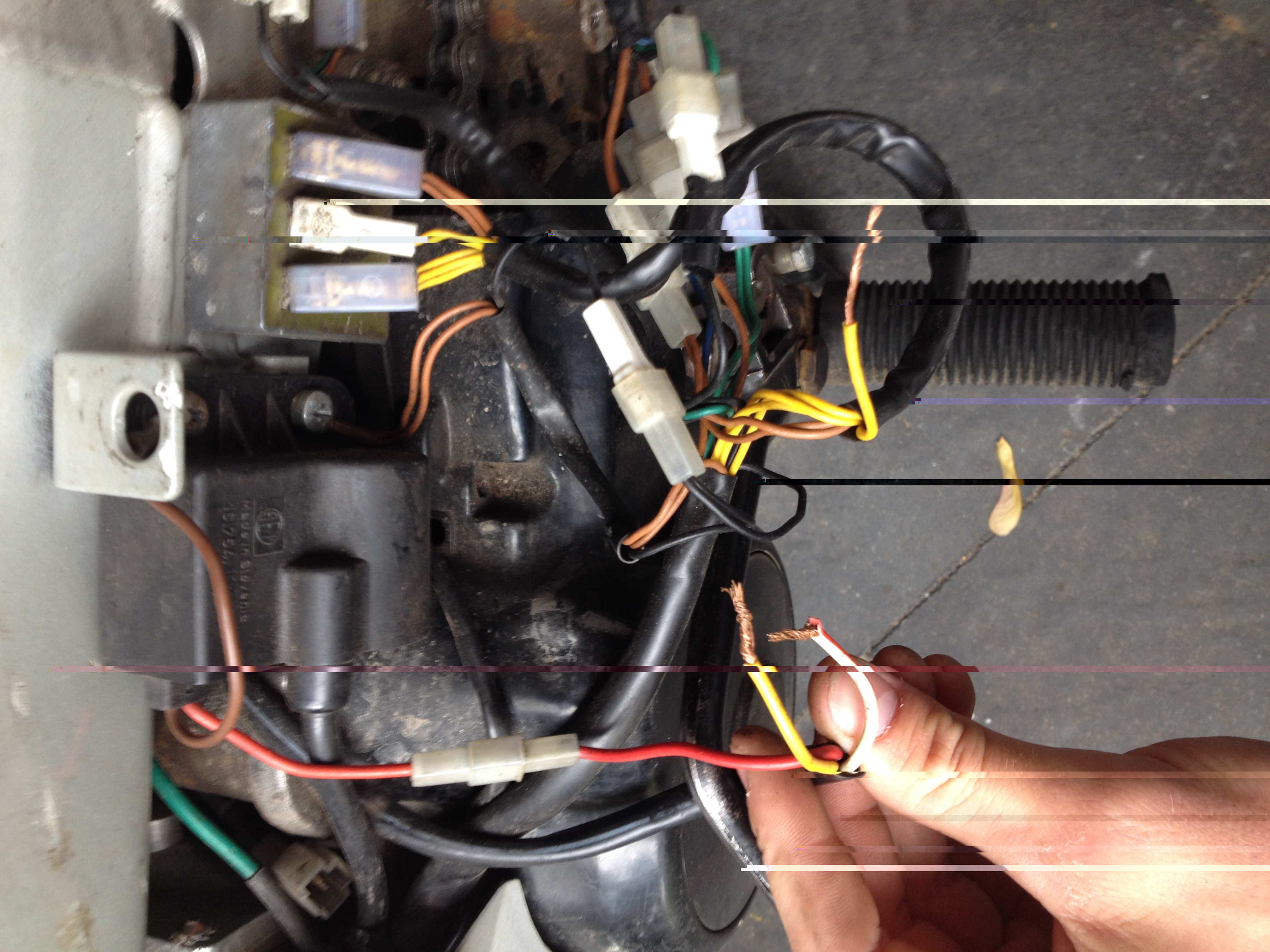 Verbind dan de 2 gele draden die je op de foto ziet met elkaar. Motor starten en lichtschakelaar aanzetten.