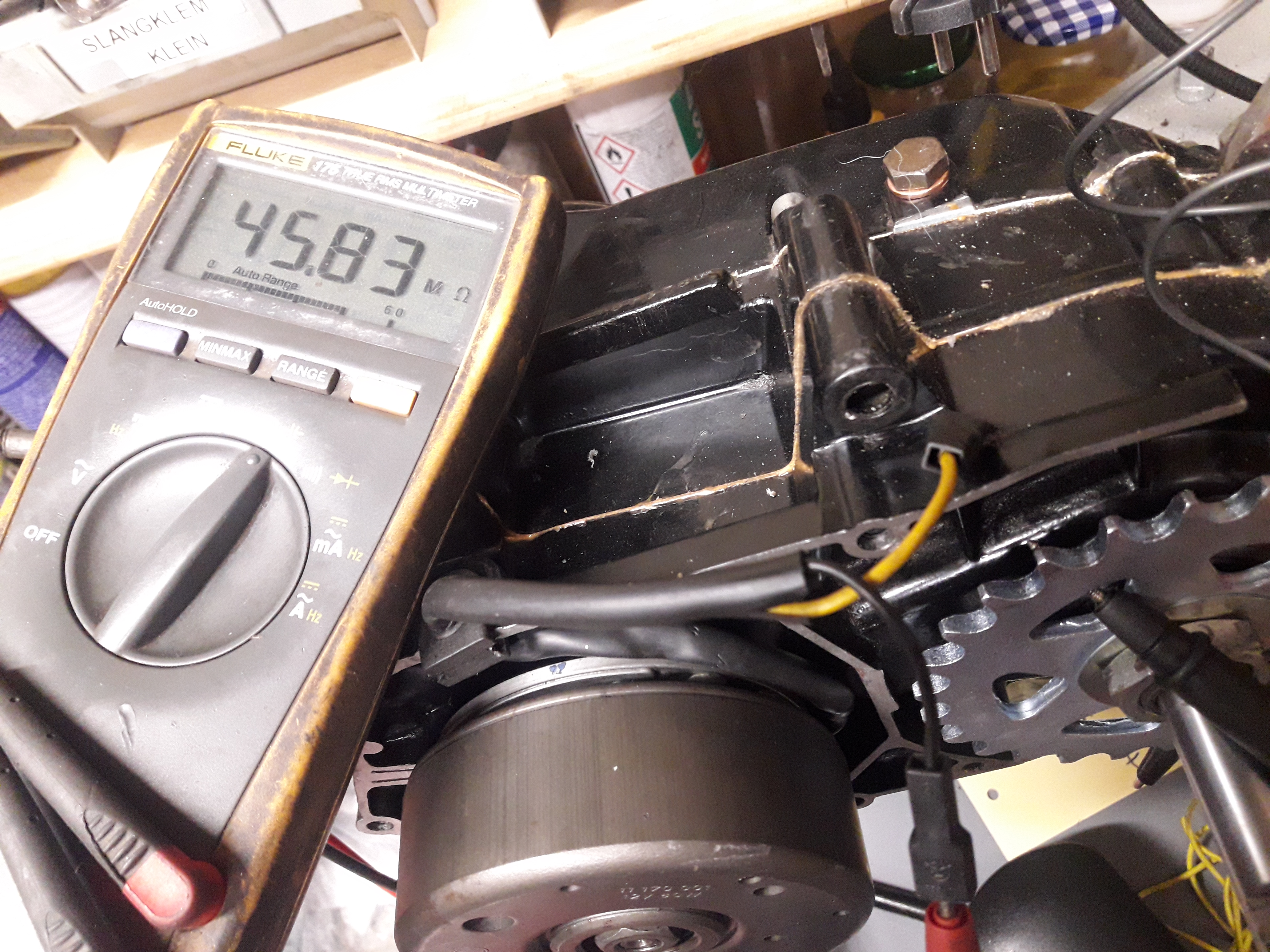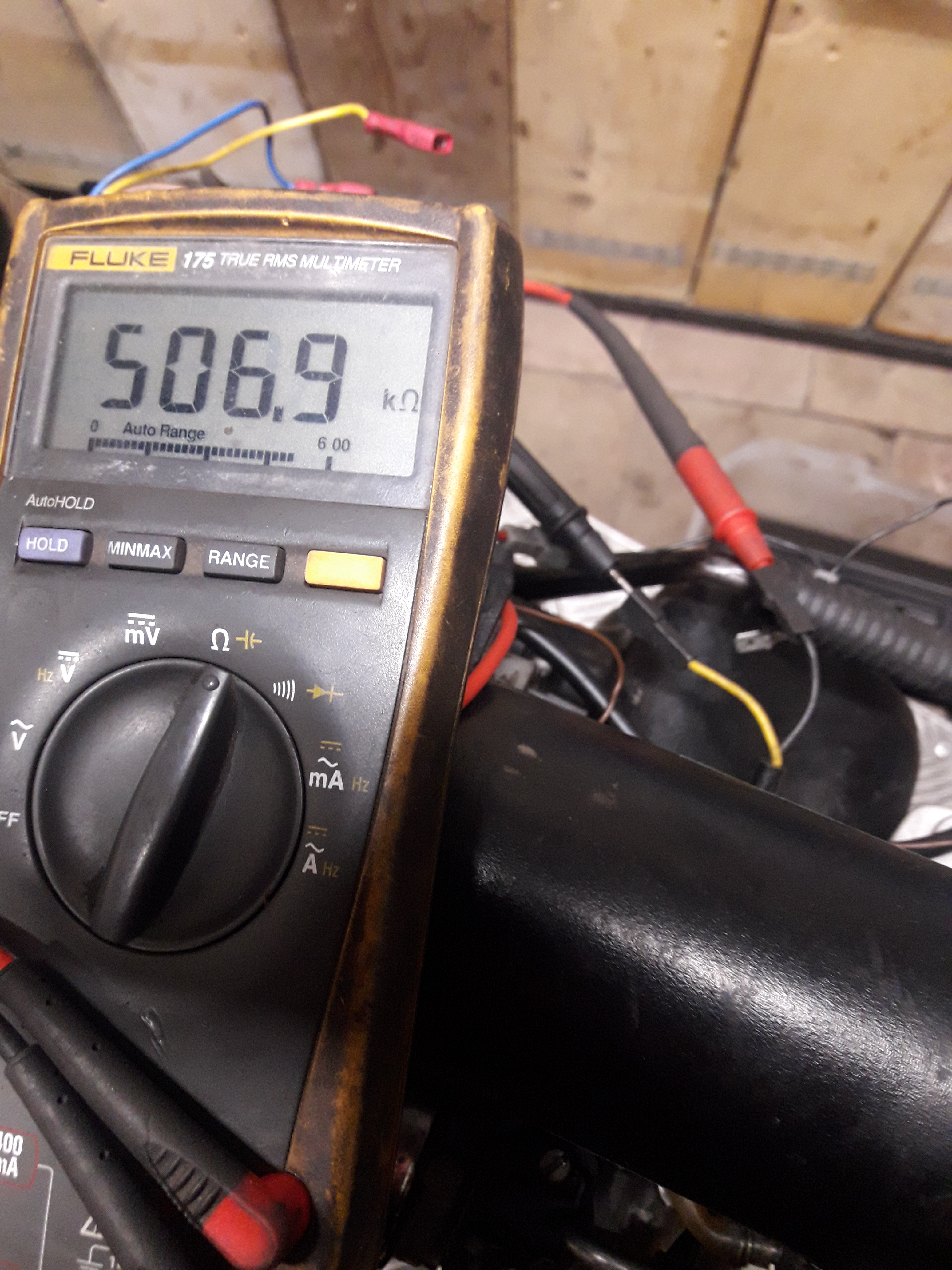 Meet met een multimeter de weerstand van cilinderkop naar carter voor de zekerheid, roestige draadeinde met verroeste moeren geleid slecht.