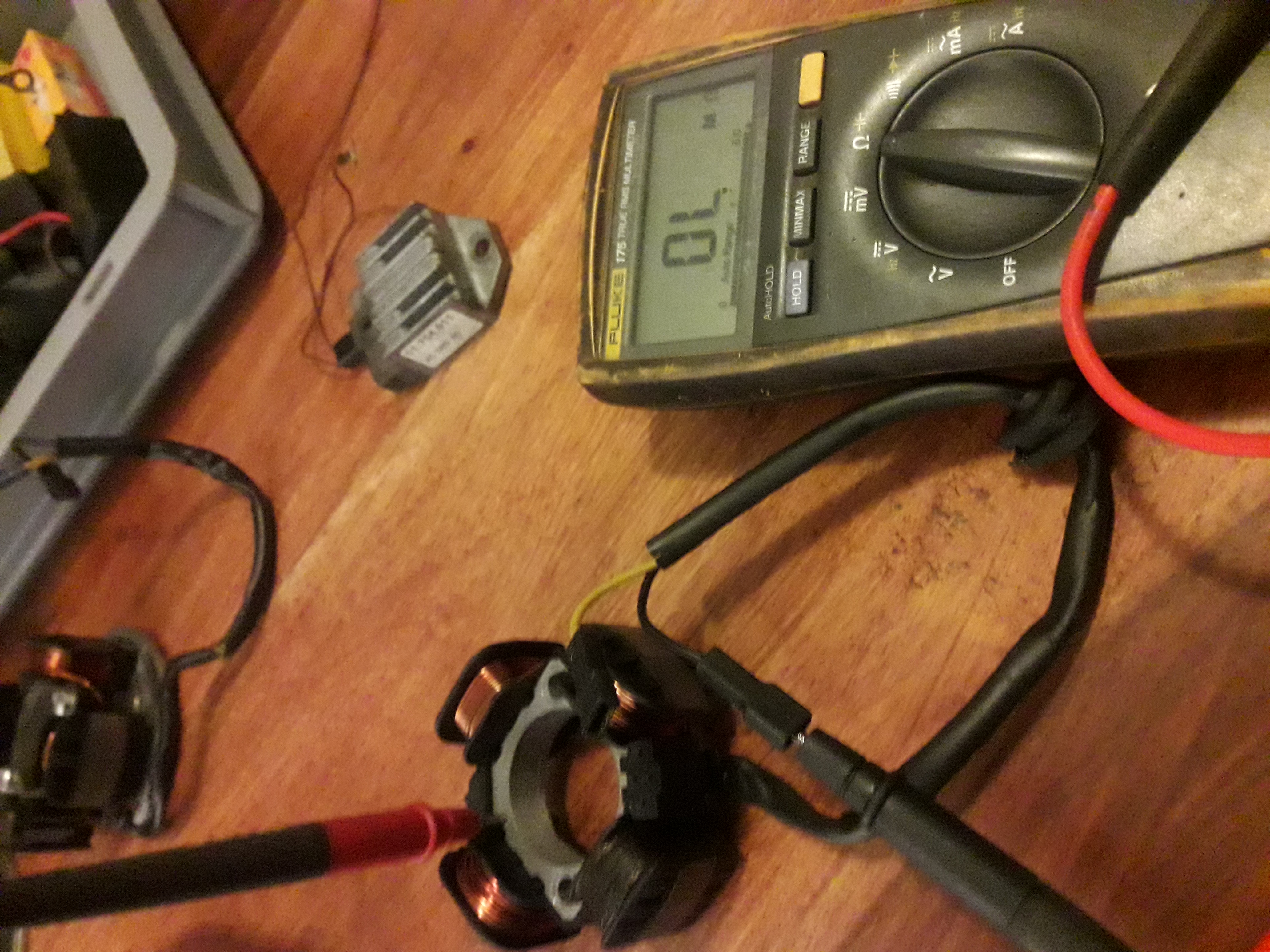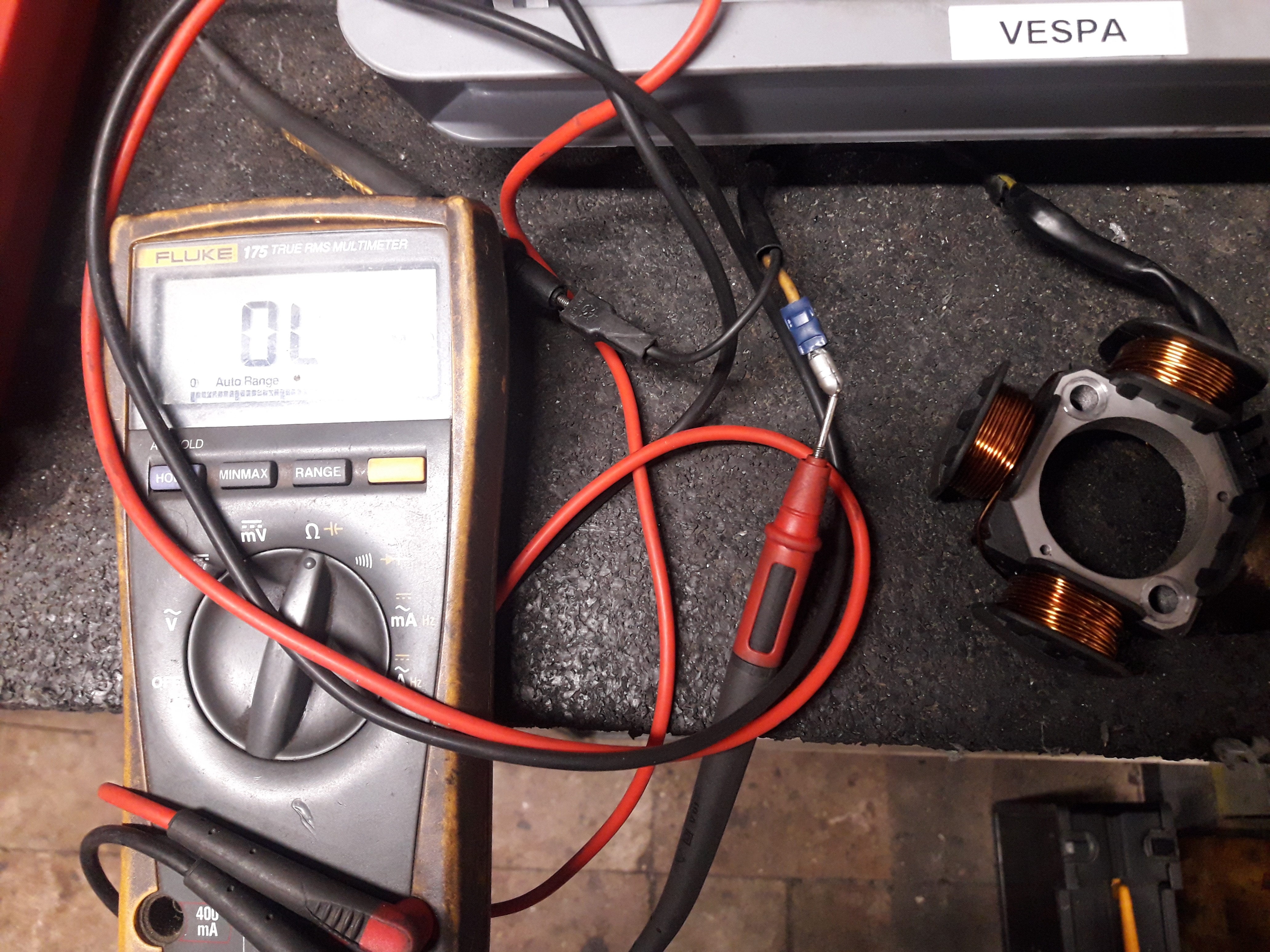 OL slaat op oneindig hoog, dus draadbreuk. Dit zie je ook op de display als de testdraden nergens aangesloten zijn. Check eens bij het plastic blokje tussen de spoelen of daar geen draadbreuk zit.