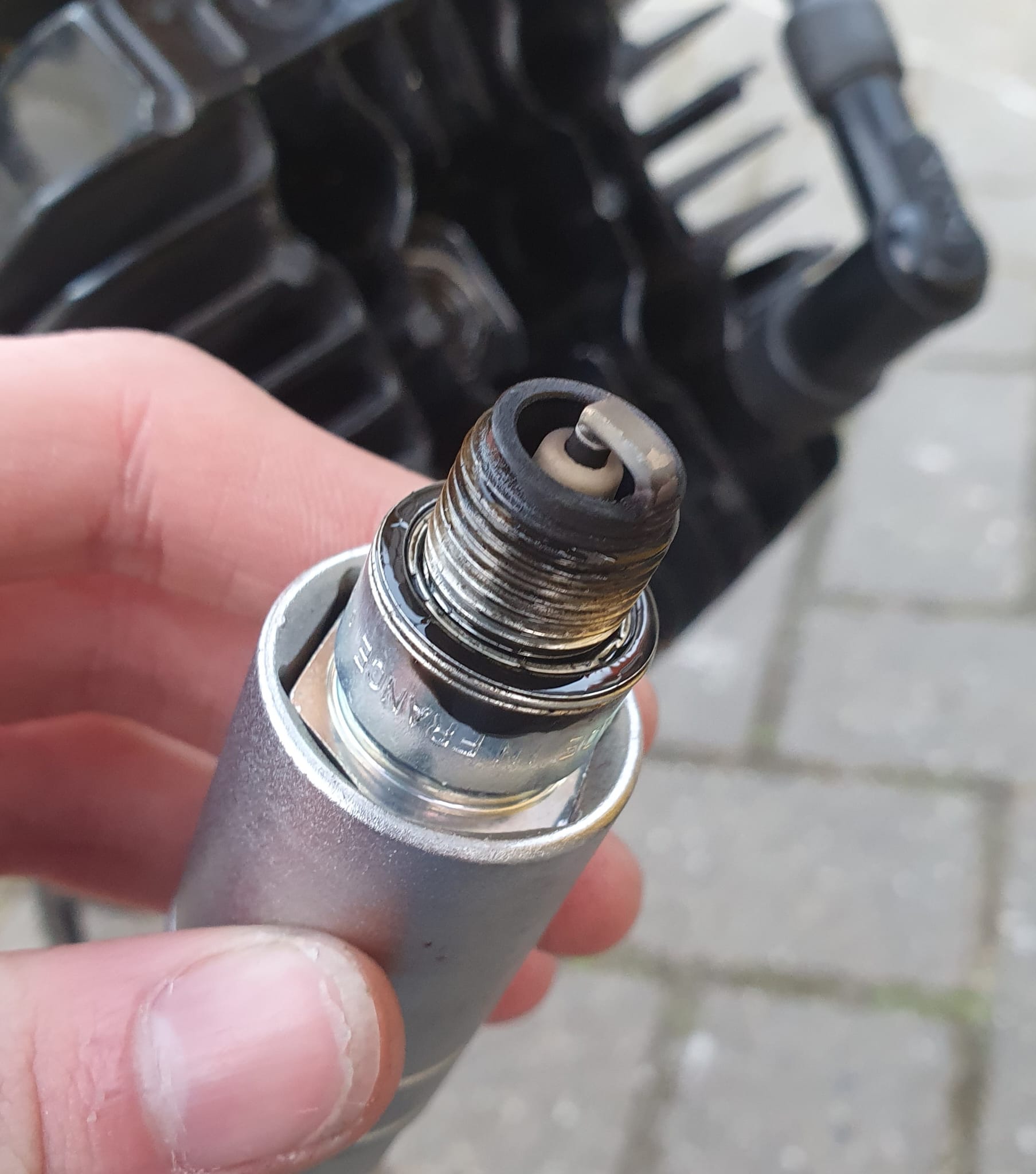 Elke keer als ik mijn bougie verwijder na een stukje rijiden zit er een hoop zwarte olie rond het gat, dus in essentie buiten de verbrandingskamer. Zie fotos:
