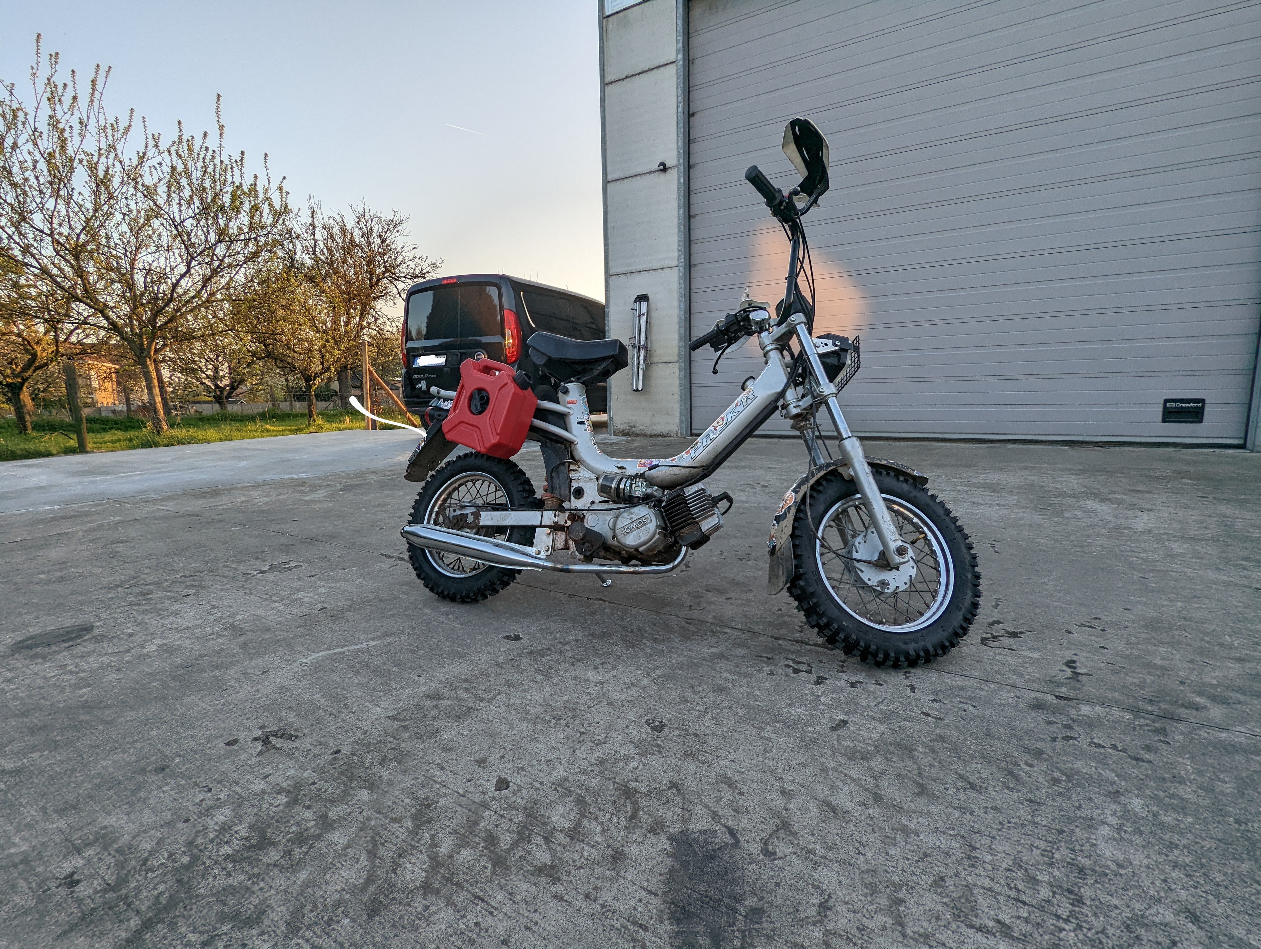 Sproeier 65, erin, trok voor geen meter. Dan 72, dit ging beter al, een stuk beter. Maar ik denk nog steeds niet zoals een 65cc zou moeten trekken / rijden.