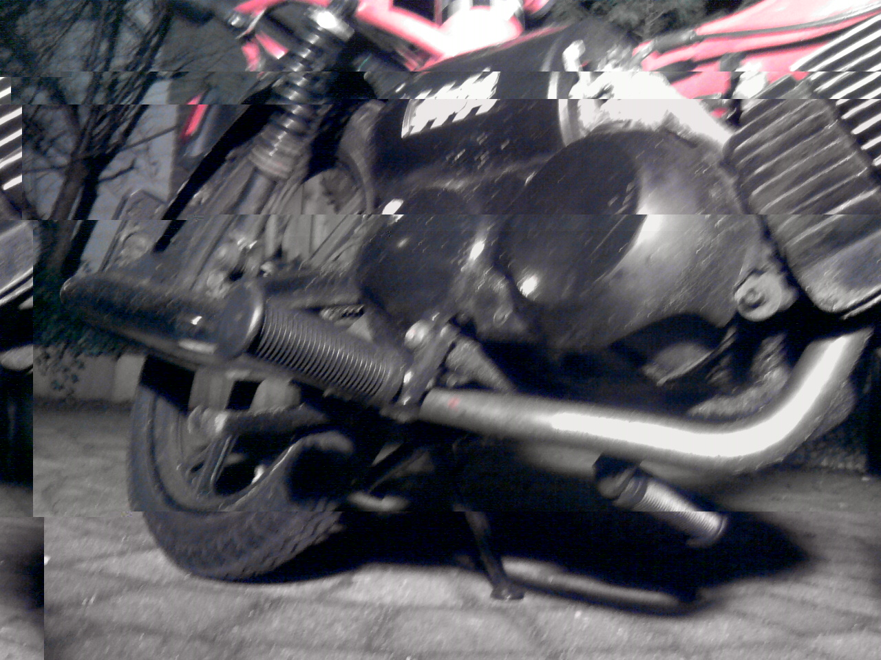 Die uitlaat is er sowieso later op gekomen. Kijk maar eens hoe hij achterop vastzit.