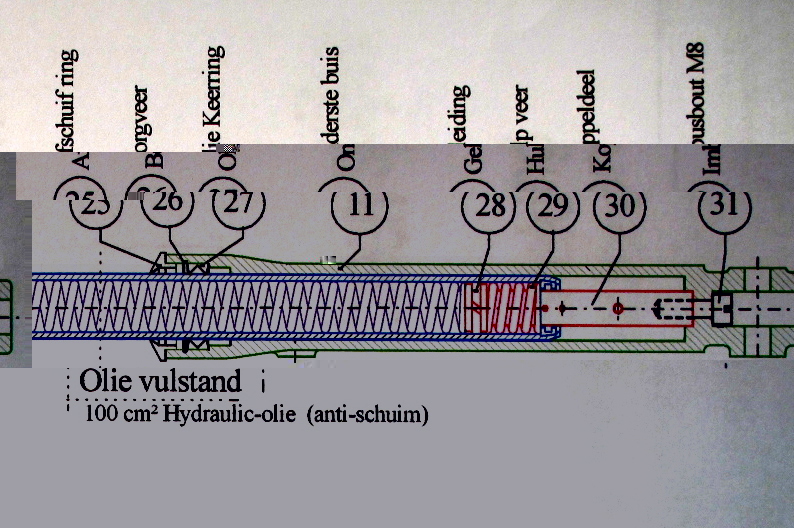 hand laten glijden. Indien dit het geval is moet je dus een andere buis of buizen op de kop tikken. Op de tekening zie je een blauwe en een groene buis . Deze twee buizen lopen ( glijden )behoorlijk presies in elkaar. Heb je niet vergeten de opvulbusjes bovenop de lange veer te monteren. In dit geval zou namelijk de veer te kort zijn.Vooral goed schoon zonder zand etc, monteren.