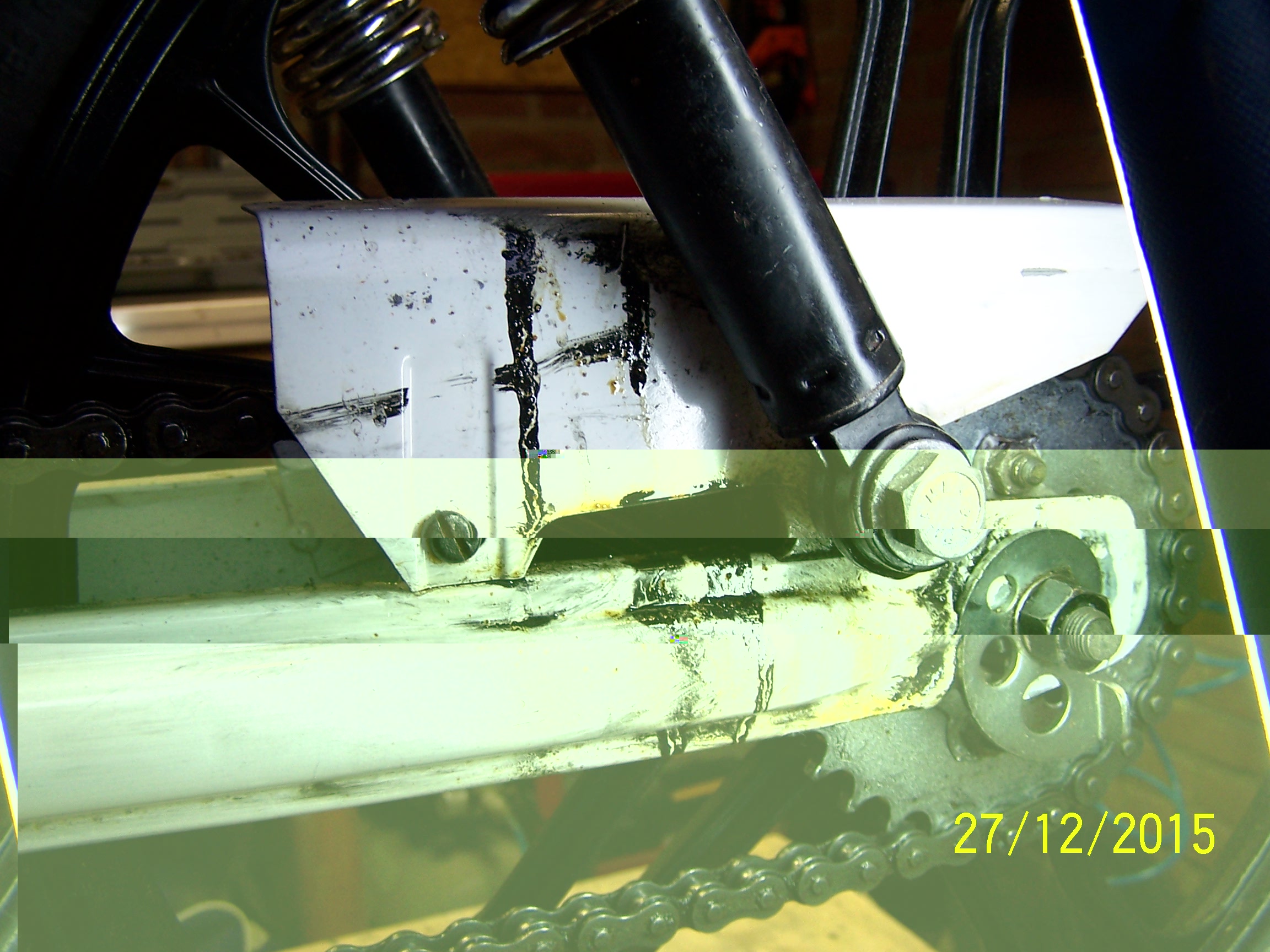 Ook al gevraagd aan een fietsenmaker die roept standaard voortandwiel keerring of kickstartkeerring, nu had ik dat zelf ook in eerste instantie gedacht, maar al paar keer gecontroleerd. Ook lijkt mij dan aangezien mijn ATF rood is, dat hij dan ook rood lekt/ spat en ruikt naar ATF, maar het is gelig. zie foto hier is maar een stukje te zien maar je ziet wel gele residu. Wel heb ik de achterbrug al gedeeltelijk schoongemaakt, na elke rit van ongeveer 14 km doe ik dat omdat alles dan zo onder zit. Voor de rest niets schoongemaakt dus foto zijn zoals het was.