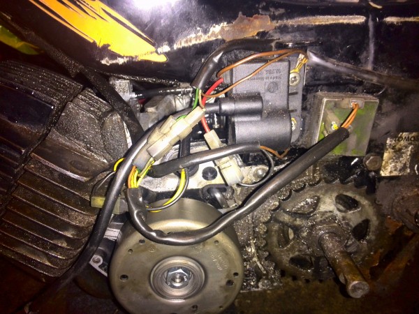 Je keering lekt een beetje zo lijkt het, zou mogelijk meteen je vastloper verklaren. Als je de zwarte draad uit je blok nu is direkt op de rode van de bobine aansluit, doet ie het dan wel? Je schakelaar op het stuur staat toch wel goed he?