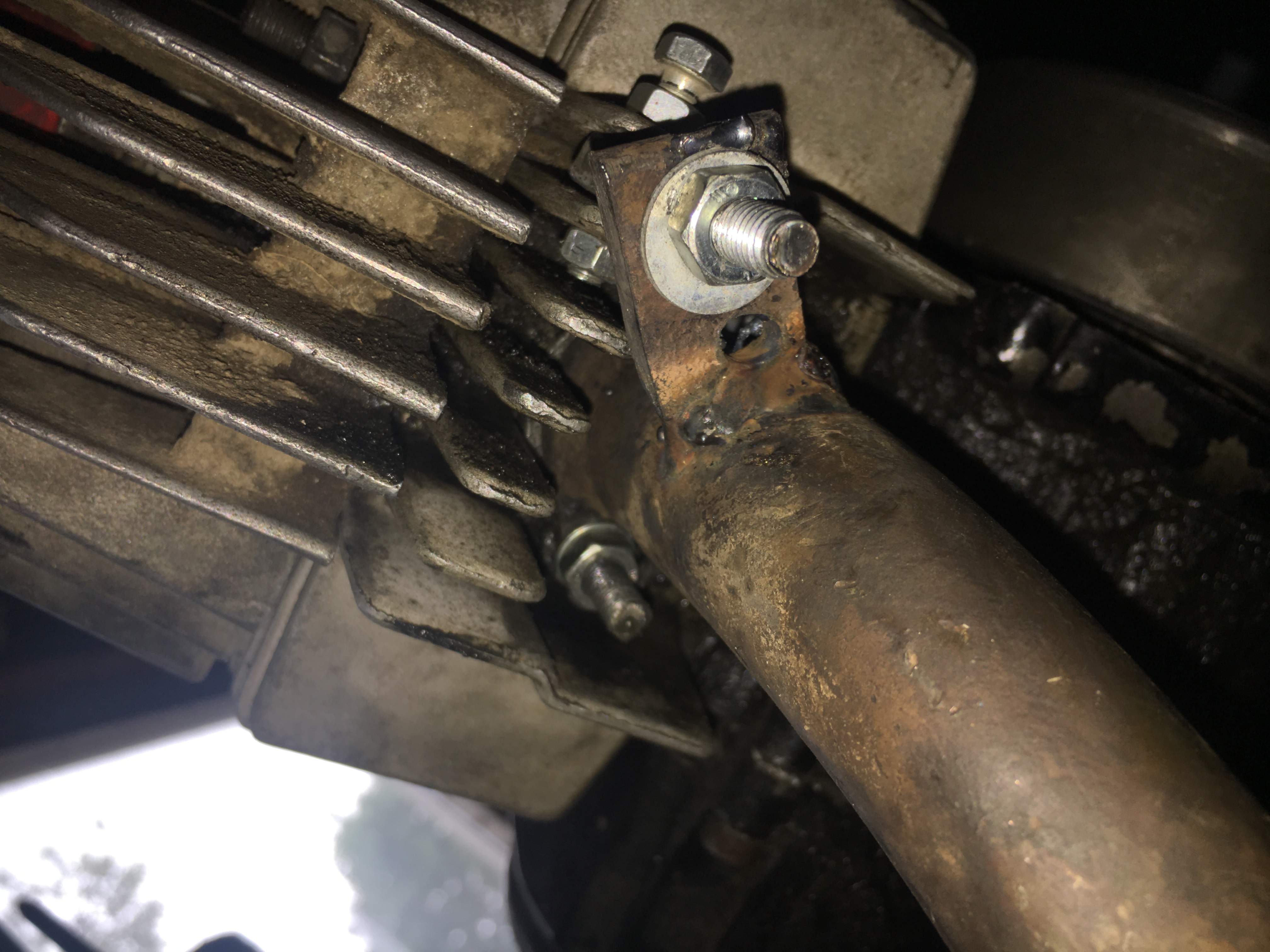 het idee is dus om gaten in de koelribben te boren en daar gewoon een normale bout+moer door te doen. dan zo'n bout met oog eraan die dan dus een beetje naar de zijknt moet anders blijft hij tussen de koelribben en dan de flens zo'n rondje of iets eraan te maken(lassen) en iets naar beneden te maken zodat die bout er net doorheen kan en er een moet op kan.