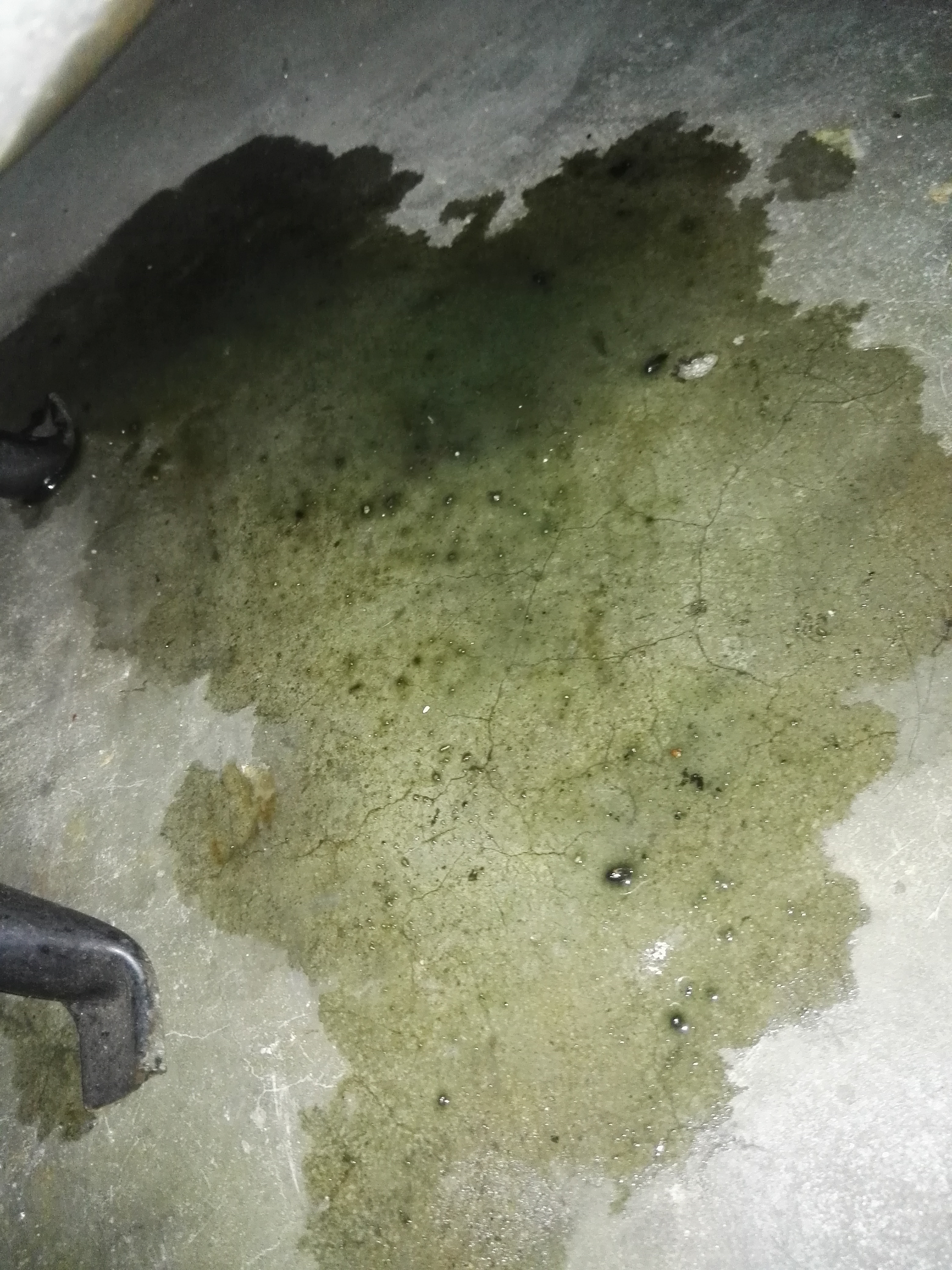 - in de berging las een plas groen achtige derrie met donkere stukjes er in.