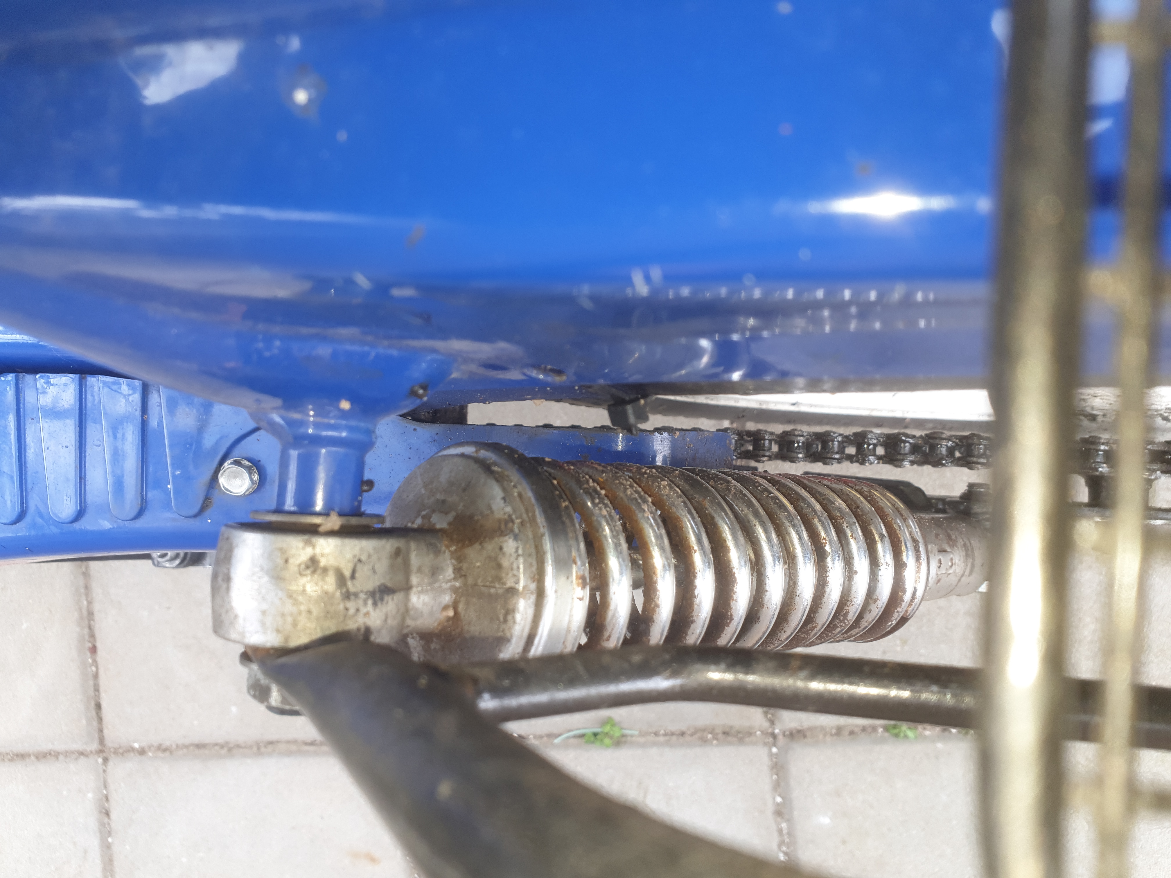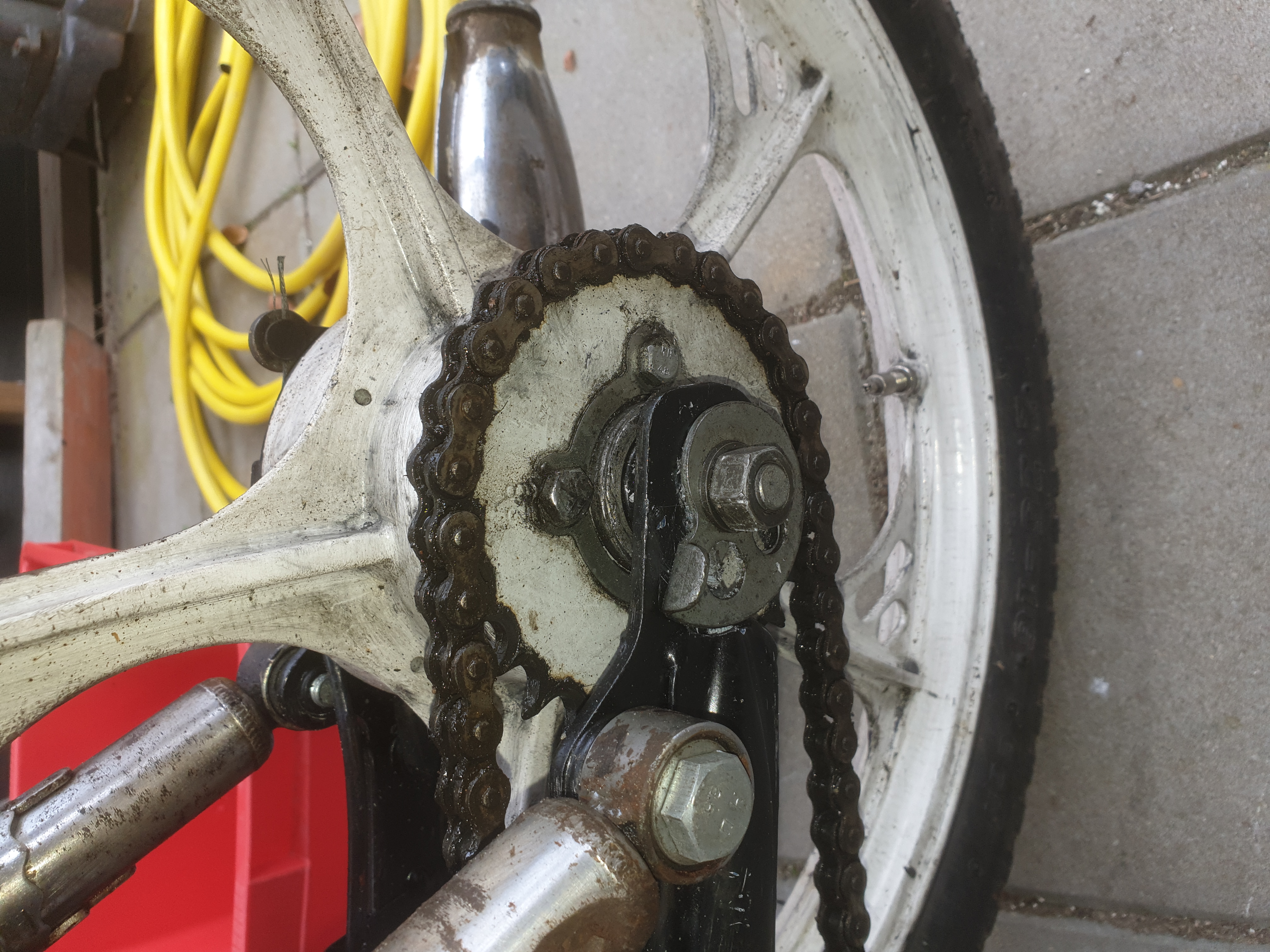 Ik heb wat foto's bijgevoegd, hoop dat ze een beetje duidelijk zijn. De ketting ligt recht ( moet nog wel gespannen worden eigenlijk). Frame lijkt niet gebogen en alles ziet er uit alsof het er goed in ligt.