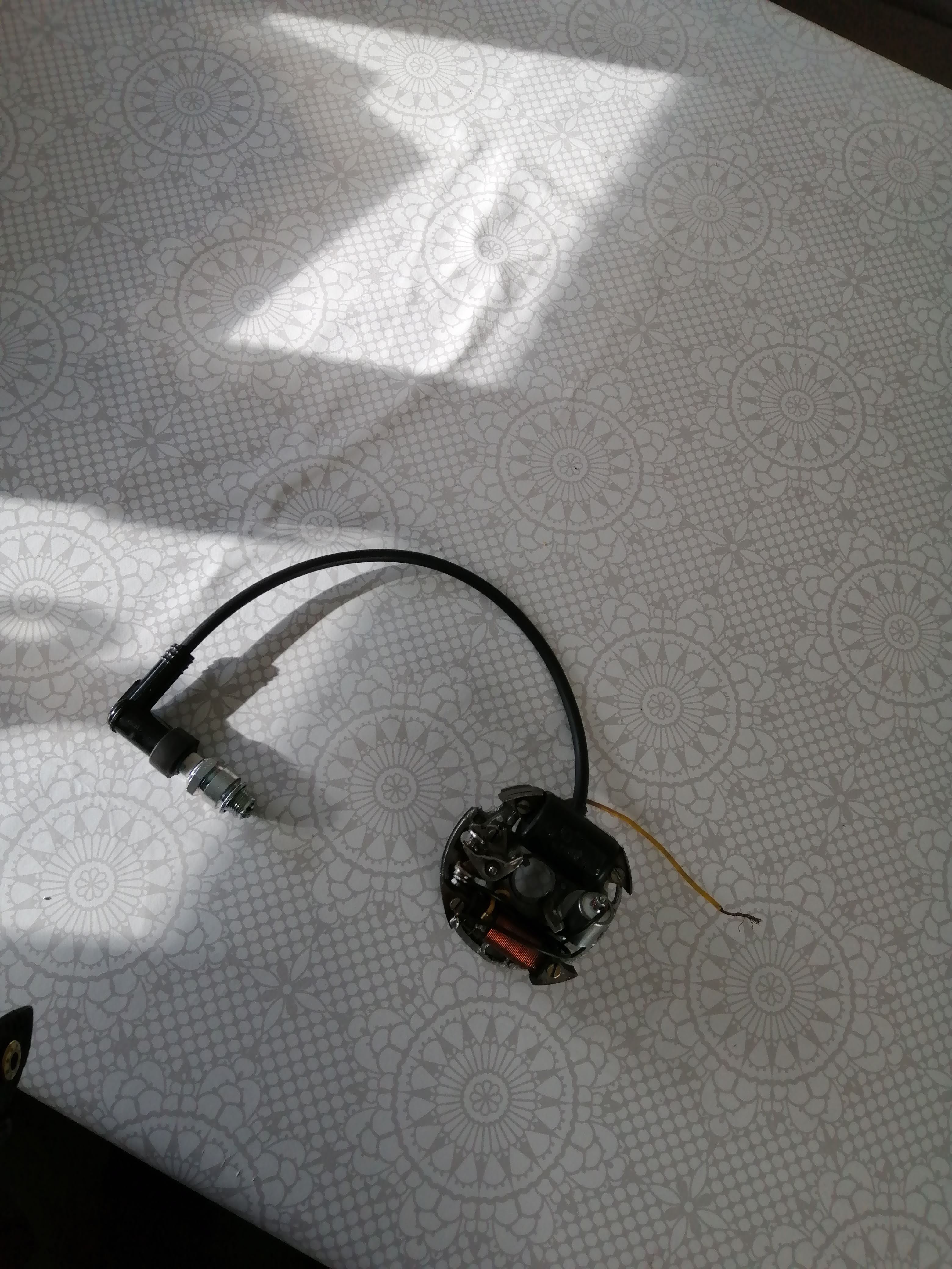 Die spoel met koperdraad en een gele draad eraan is de lichtspoel, dus voor de verlichting...heeft niets met de vonk te maken, zonder die spoel loopt een tomos dus gewoon.