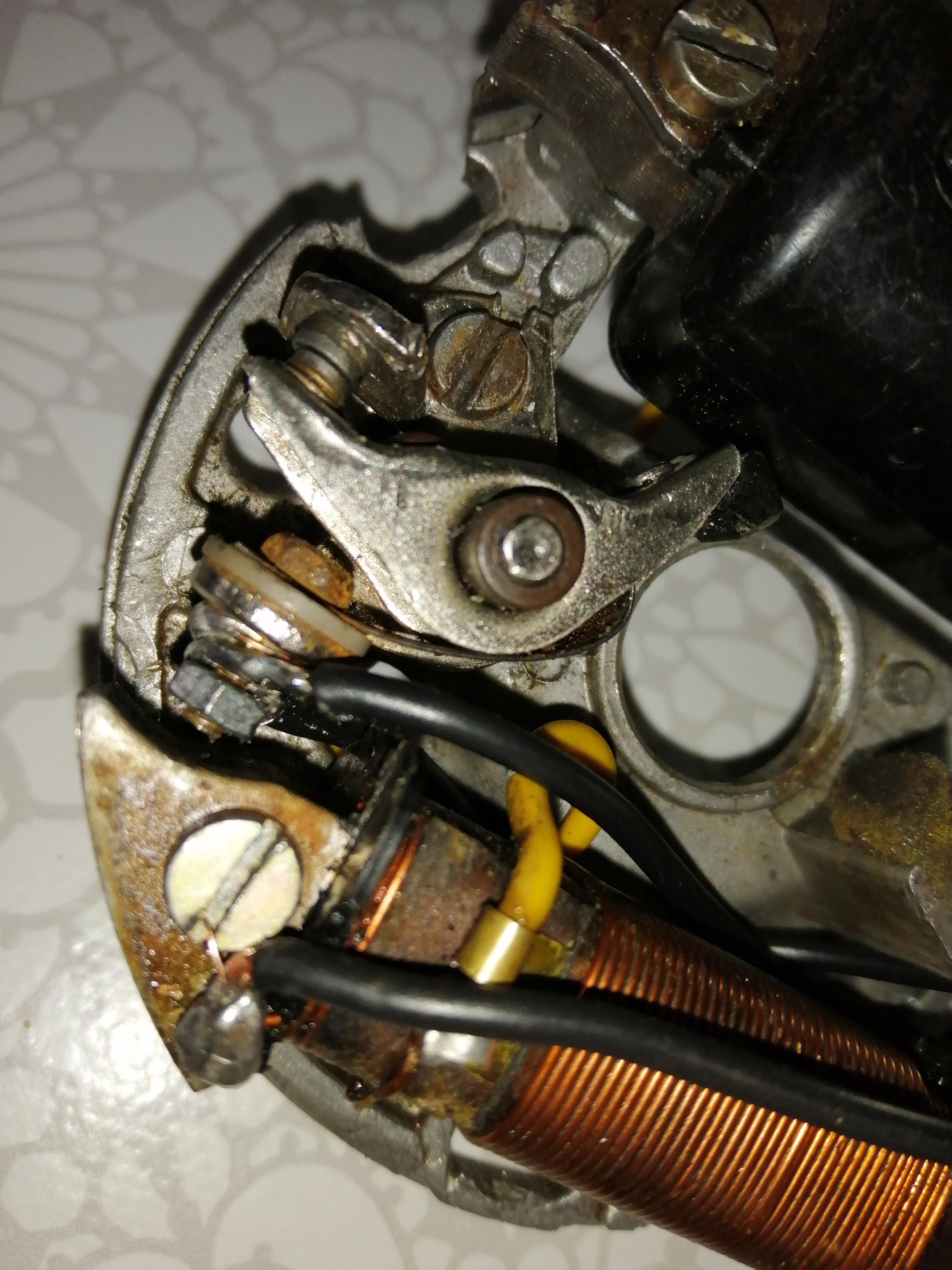 Even los van het feit of dit een ontstekingsspoel is of een interne bobine ( ik denk zelf het laatste aangezien er een bougiekabel aan vast zit), hoort de zwarte draad die op de grondplaat is gesoldeerd links van de lichtspoel daar niet. Die moet op de condensator.