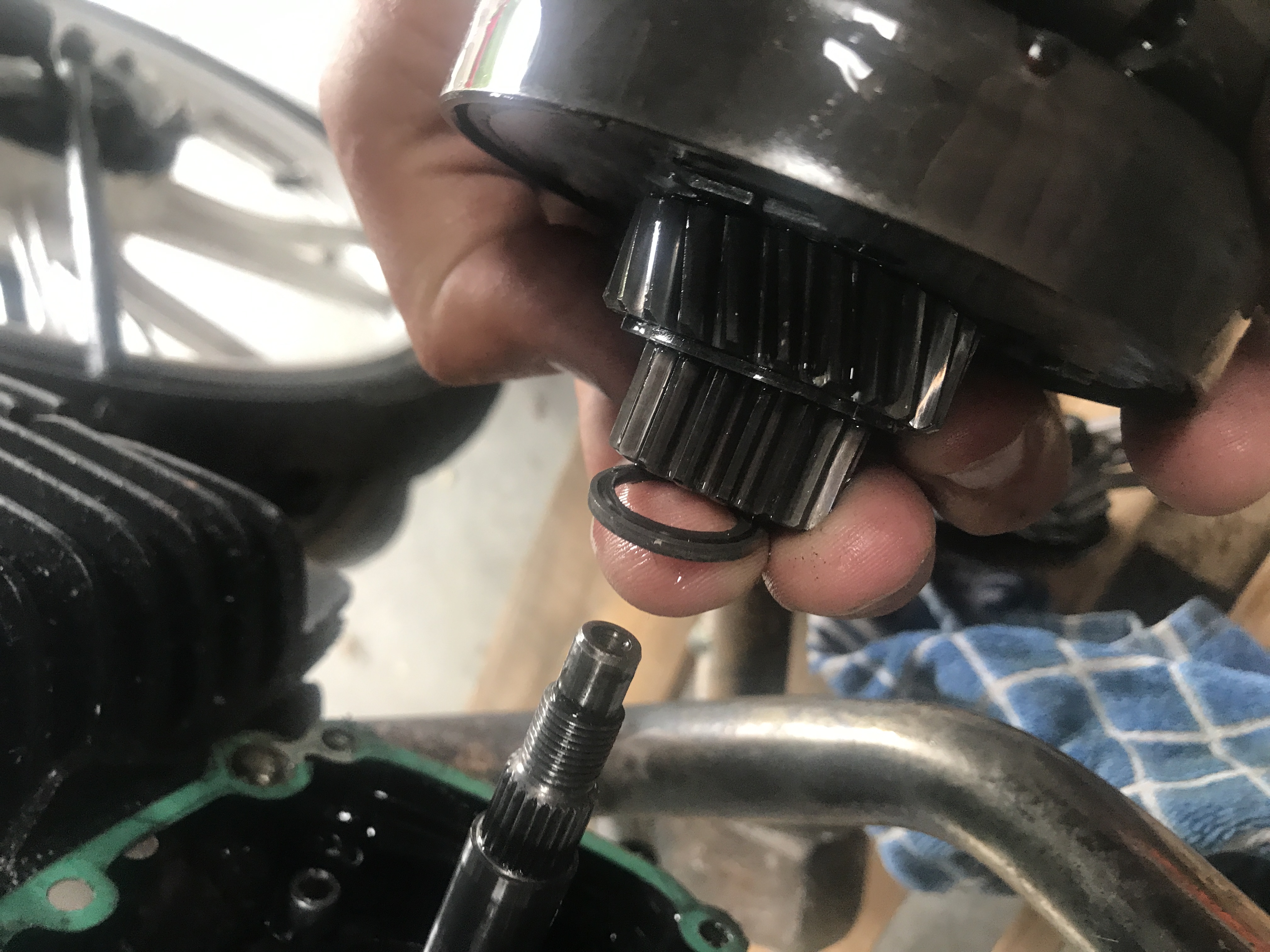 Nu hebben we alles doorgemeten en de ontsteking vervangen. Tijdens het afstellen hiervan kwam er bij 1 test veel witte rook uit de uitlaat en onder de koppelingsbak vandaan, en draaide de kickstart opeens keihard rond. Sindsdien draait het achterwiel slecht/niet meer.. (ontsteking nu wel goed afgesteld dus hij start en loopt goed). Soms draait het wiel nog een beetje mee maar met vrijwel geen vermogen.