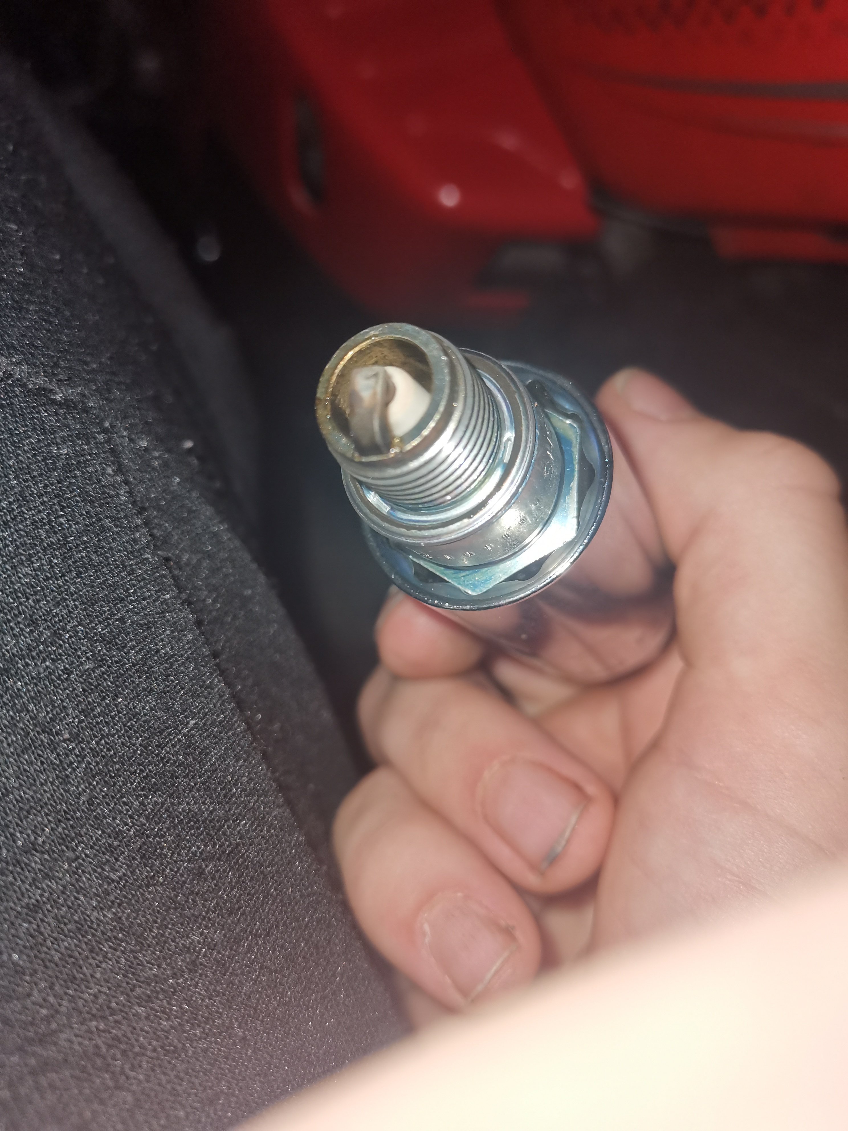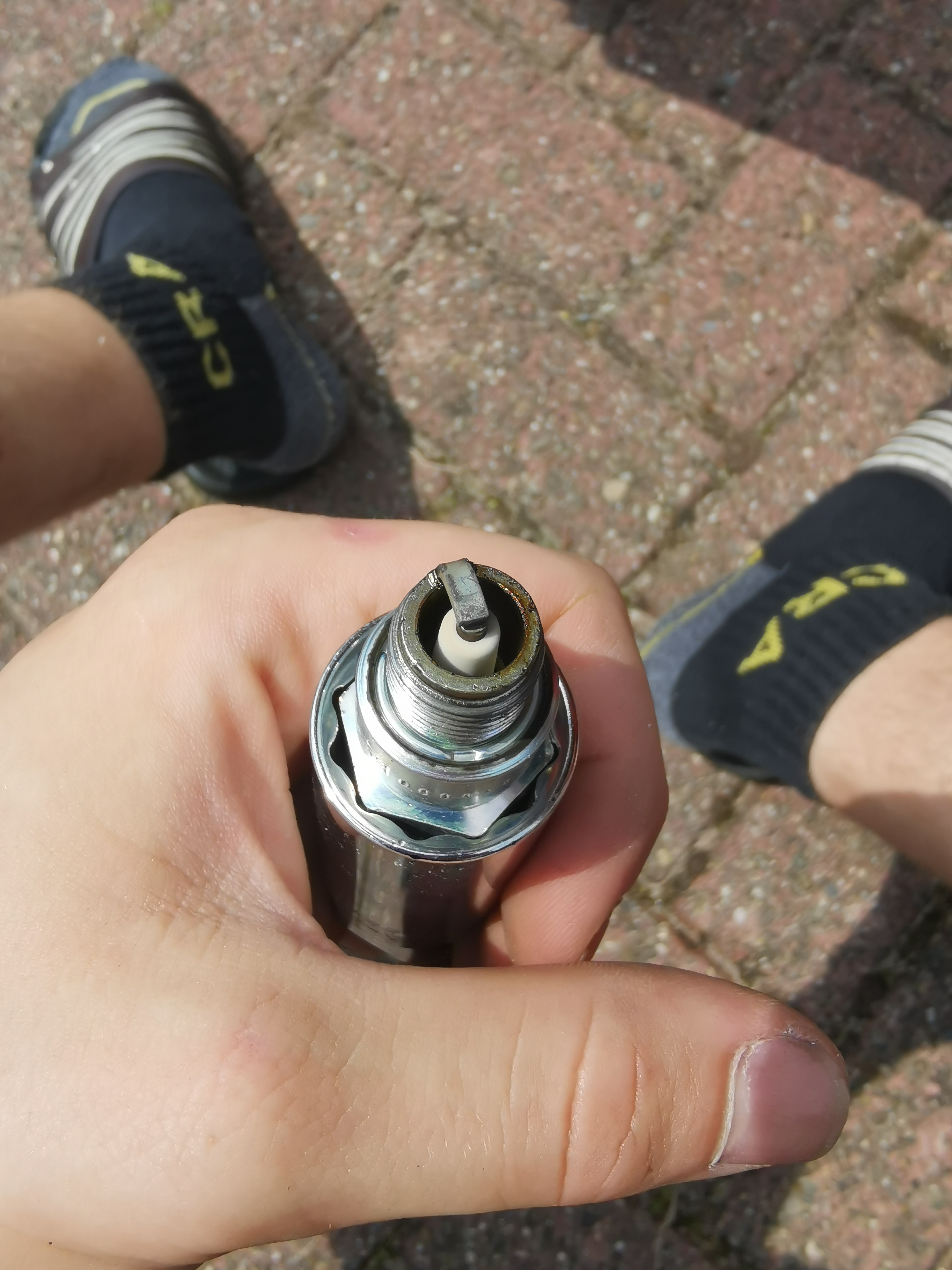 Ik zie aan de rand van je bougie een zwarte/ natte laag, wat duidt op een onvolledige verbranding en dus te rijke afstelling. Wat fons716 al aageeft, warme lucht kan minder brandstof bevatten dan koude lucht, dus in de zomerdagen kan het zijn (zeker nu de temperaturen richting de 30 graden gaan) kan dan juist een grotere sproeier problemen geven. Vaak is de af-fabriek gemonteerde sproeier een compromis tussen de twee uitersten om niet continue de sproeier te hoeven wisselen.
