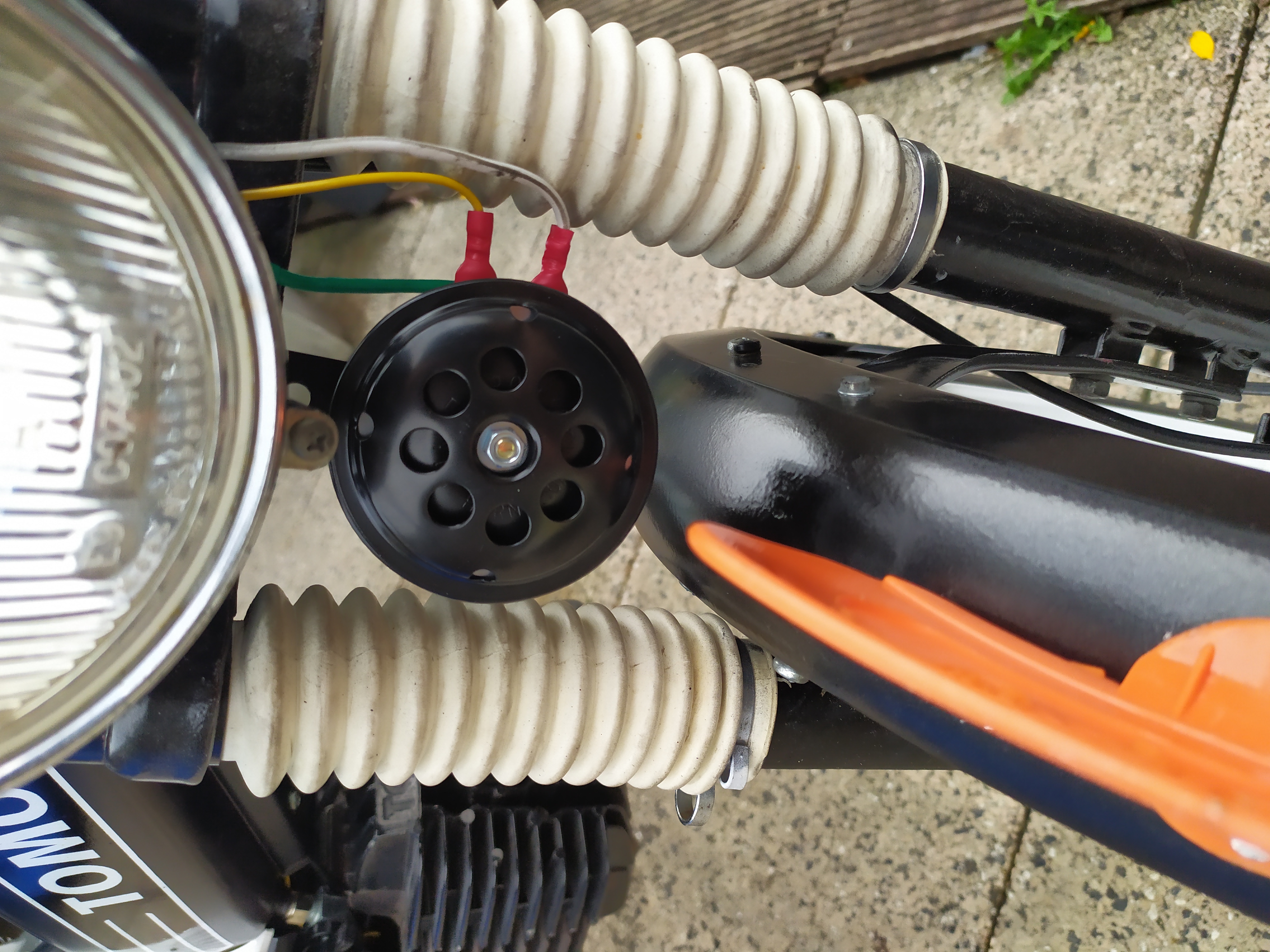 Ik wil een Claxon erop installeren maar ik weet niet hoe ik het moet aansluiten. Ik weet dat ik nog een kabel moet solderen op de knop aangezien die mist.