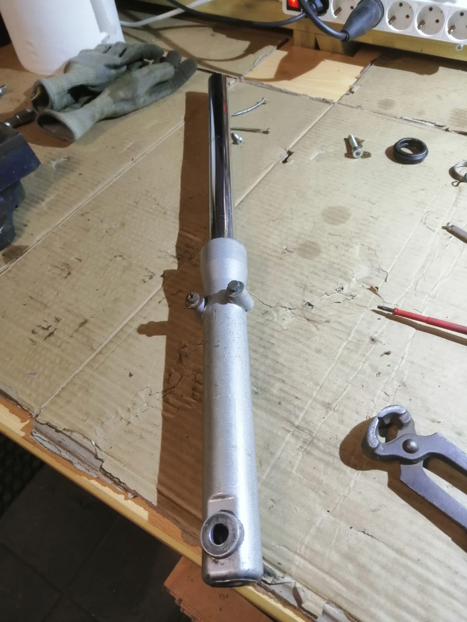 Even een uitleg voor de knapen die tegen het zelfde probleem aan gaan lopen als ik: Het boutje aan de onderkant van het grijze dikke gedeelte die houd de 2 stukken aan elkaar. je hoeft verder niks los te halen. paar tikken op geven, als het niet wil beetje oppassen want het gietijzer sla je snel naar binnen toe, waardoor je straks je kering en je stofkapje er niet meer in krijgt. Ik heb het met de gasbrander bovenaan warm gemaakt werkt top. Als je de 2 pijpen uit elkaar hebt liggen, er zit een spanstifje in de chrome pijp, kun je dr uit tikken heb je de veer mooi los liggen. de voorvork is volgens mij geen hydraulische, schoonmaken dik vet er in en gaan naar mijn idee. Nog paar foto's ter illustratie.