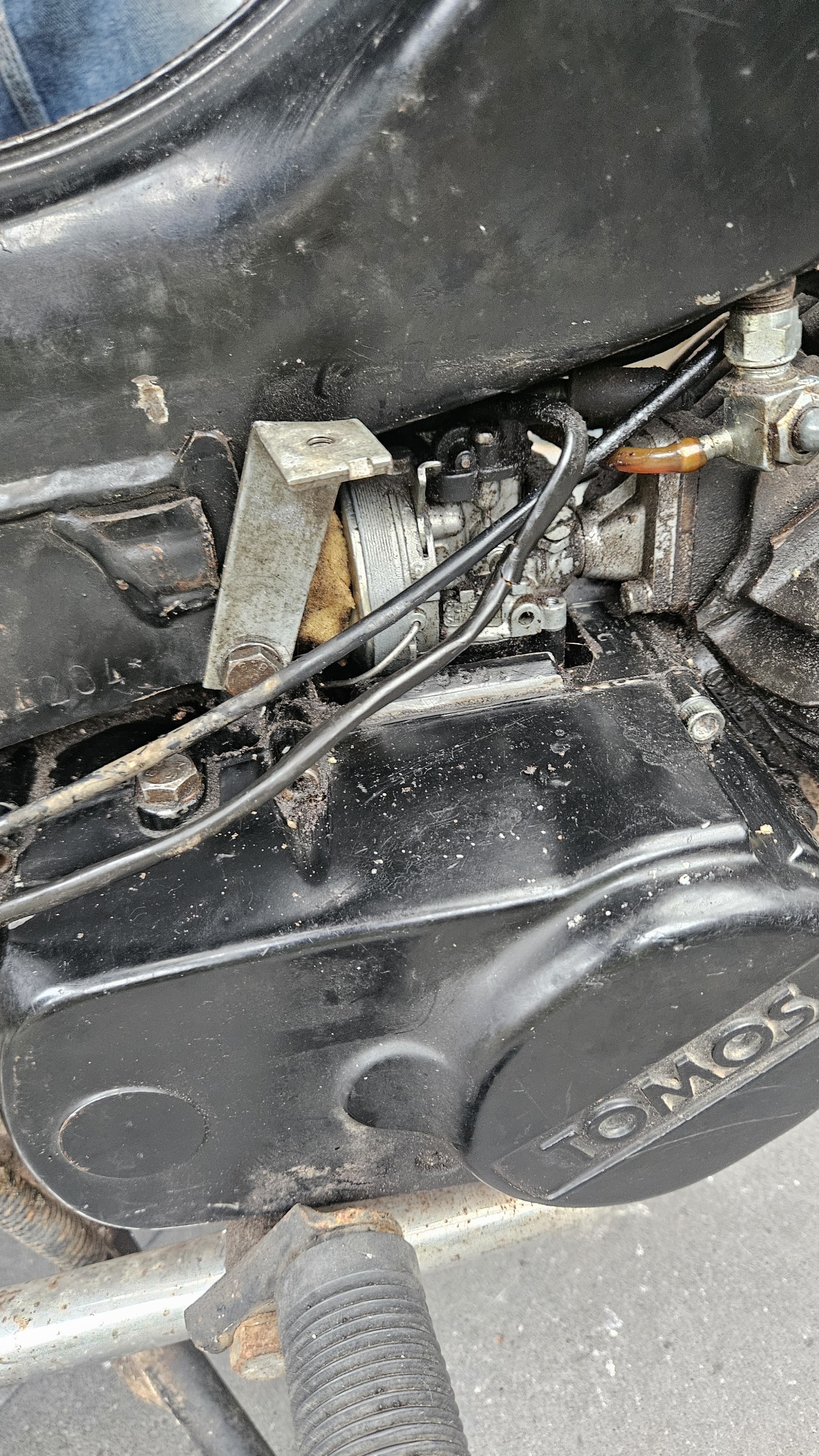 ik heb een Tomos s25 uit 2005 waarbij de carburateur onder het frame zit ipv op de zijkant van de brommer, maar wil het luchtfilter vervangen, aangezien de huidige luchtfilter een vieze spons is die in het luchtfilter aansluitstuk gepropt is (wat ik niet zelf heb gedaan). Hoe kan ik het makkelijkst bij de carburateur komen zonder meteen het gehele blok te demonteren?