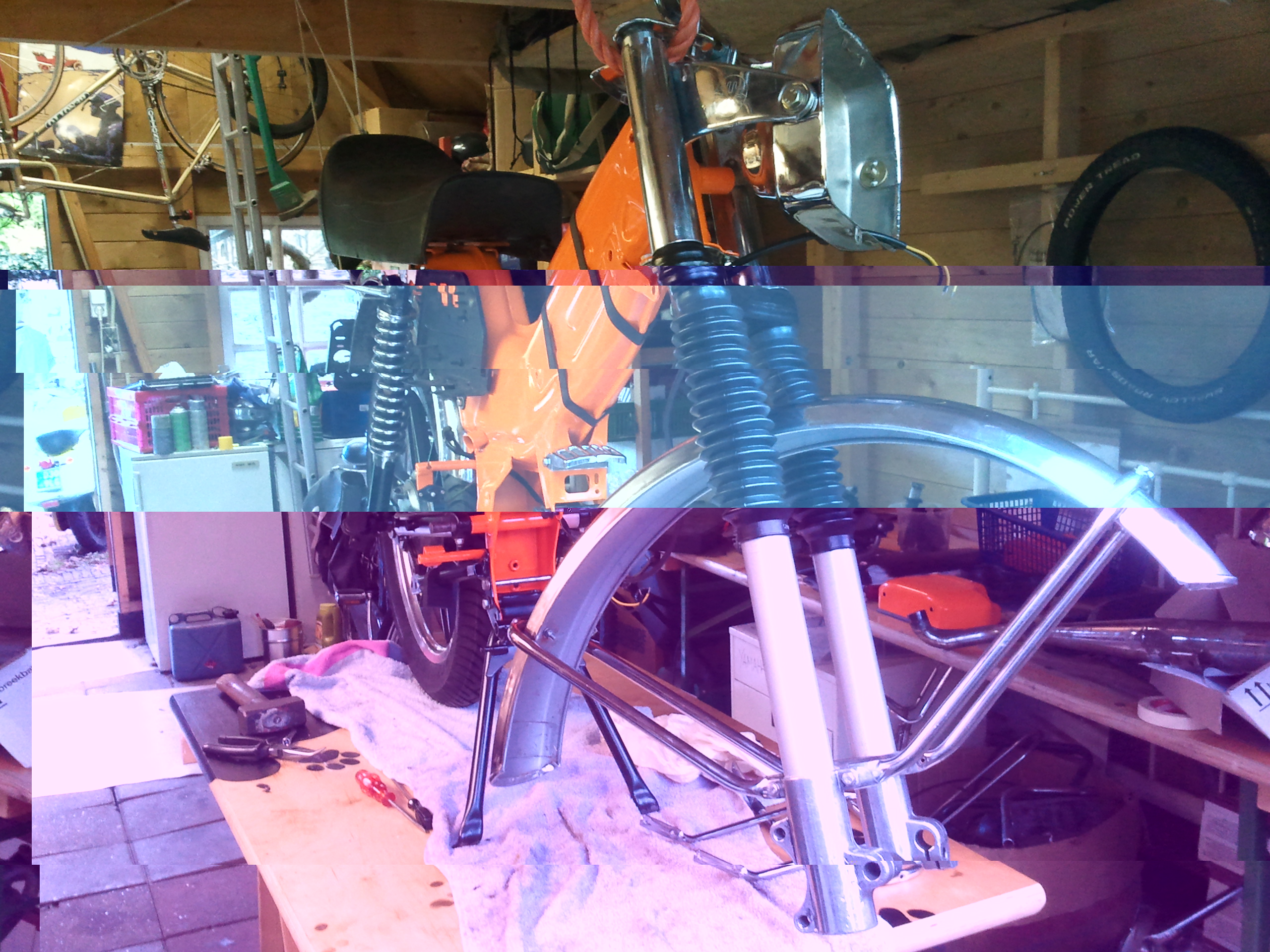Voorvork heb ik gereviseerd volgens het boekje en in theorie zou deze nu weer gewoon goed moeten veren.. alleen toen ik hem van de tafel afhaalde en op de grond zette veerde 'ie maar heel weinig tot niet.. Ook had ik een, volgens de verkoper, een zgan standaard gekocht en nu deze gemonteerd is lijkt de standaard wel doorgezakt te zijn.. Ik ga kijken of ik nog kan achterhalen van wie ik deze heb gekocht Ook had ik opnieuw verchroomde spatbordbeugels gekocht alleen heeft hij mij de verkeerde toegestuurd en gaat dat ook weer lang duren.. Spullen van KP zijn ook nog niet binnen..
