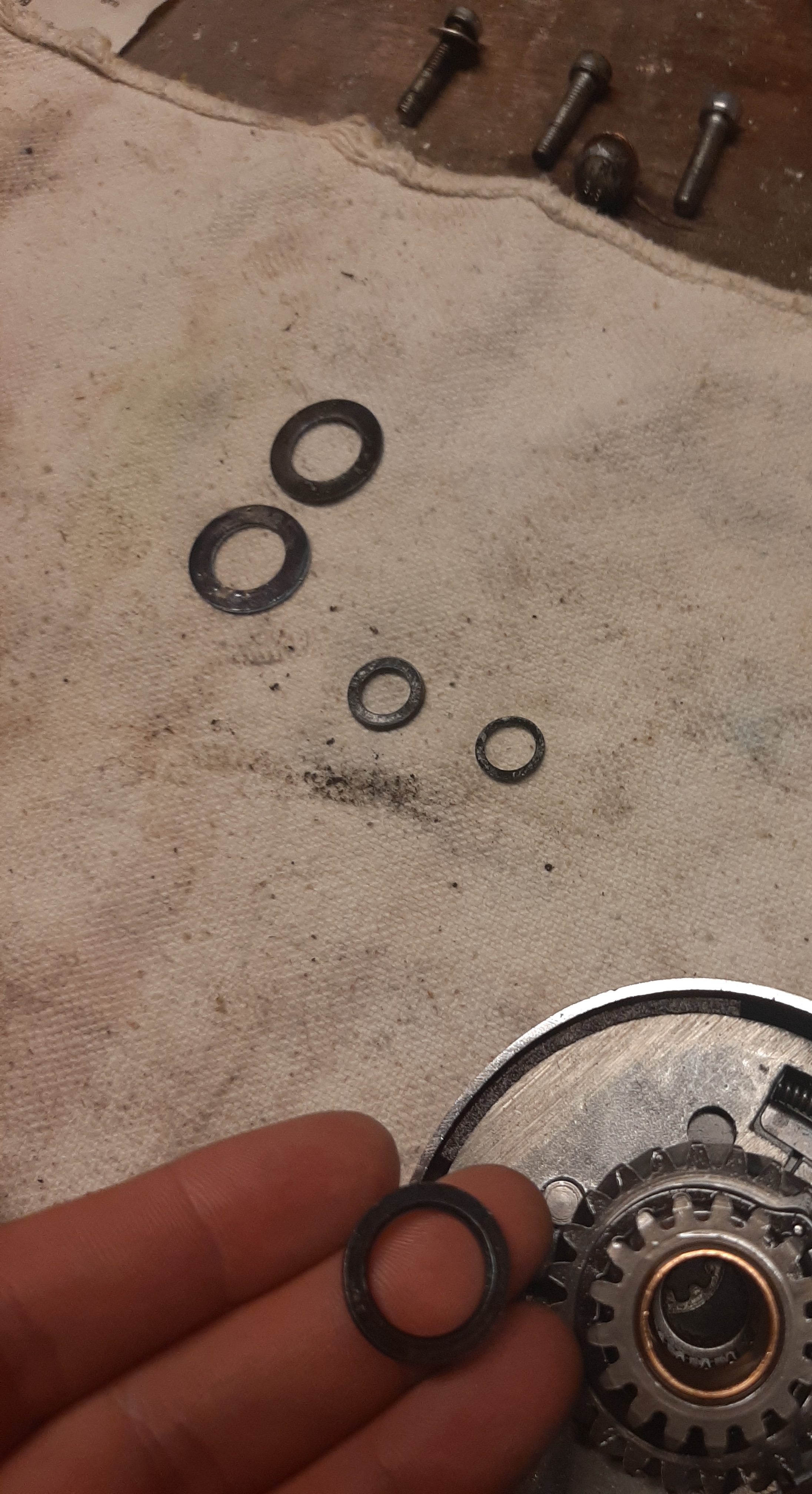 Tussen krukaskeerring en tandwielen achterop het koppelingshuis hoort een ring te zitten van 2 mm dikte. Past percies op de as. Ik zie op de foto nog zo'n diameter ring, waar komen deze vanaf?