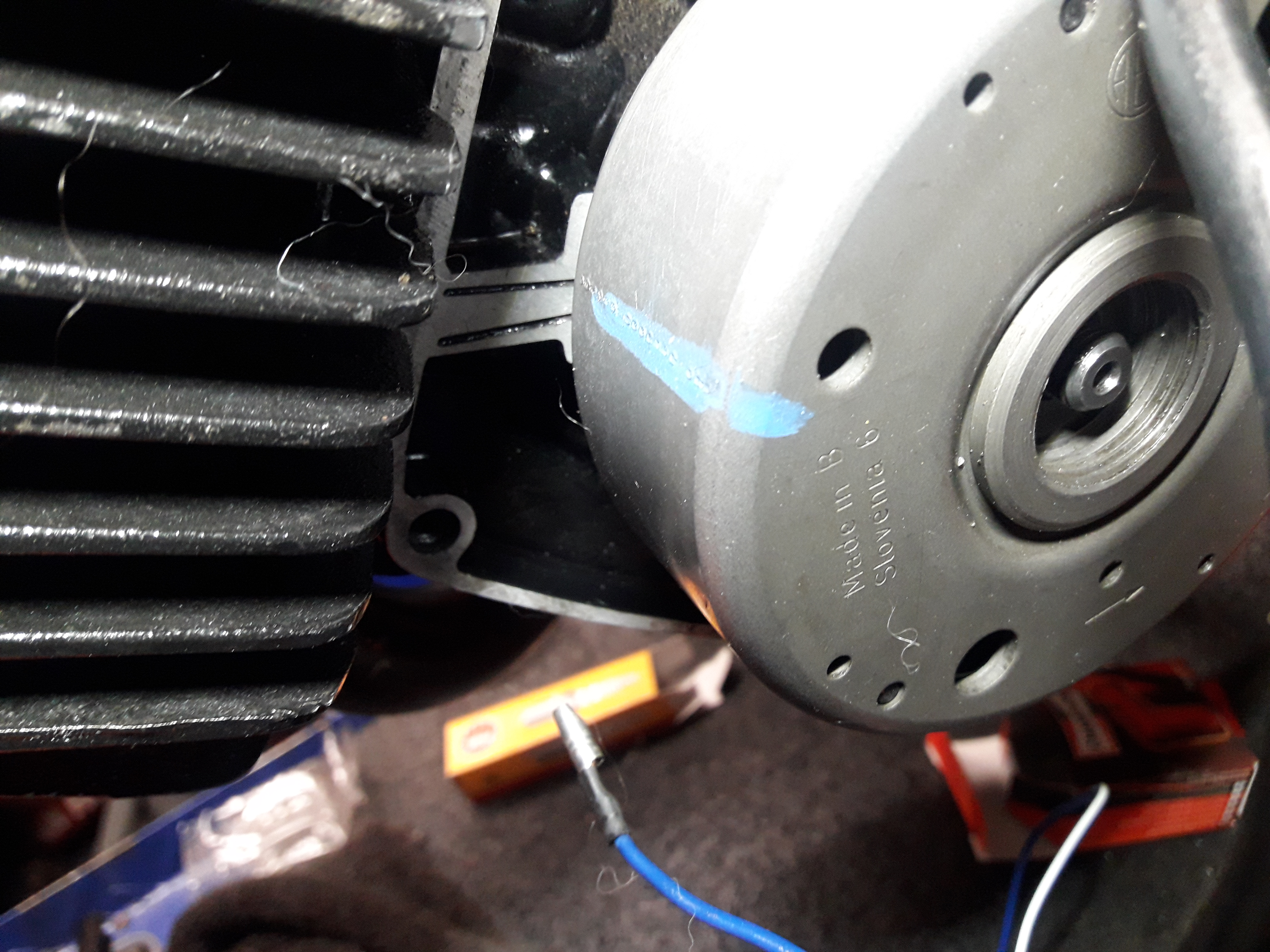 Op het vliegwiel staat als het goed is een stippellijn, die moet dan gelijk zijn met het bovenste streepje op het carter (bromstand) met de lamp.
