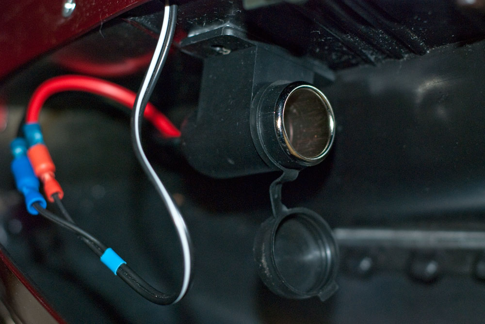 Het "sigarettenaansteker" contact in de bergruimte. Bovenaan zie je de doorvoer. Je hoeft niet te boren o.i.d.