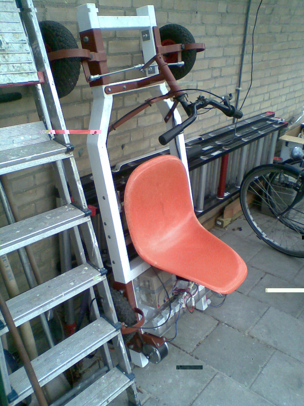 met twee motoren van elektrische stepjes en vier accu's. Top: zon 20 km/u.