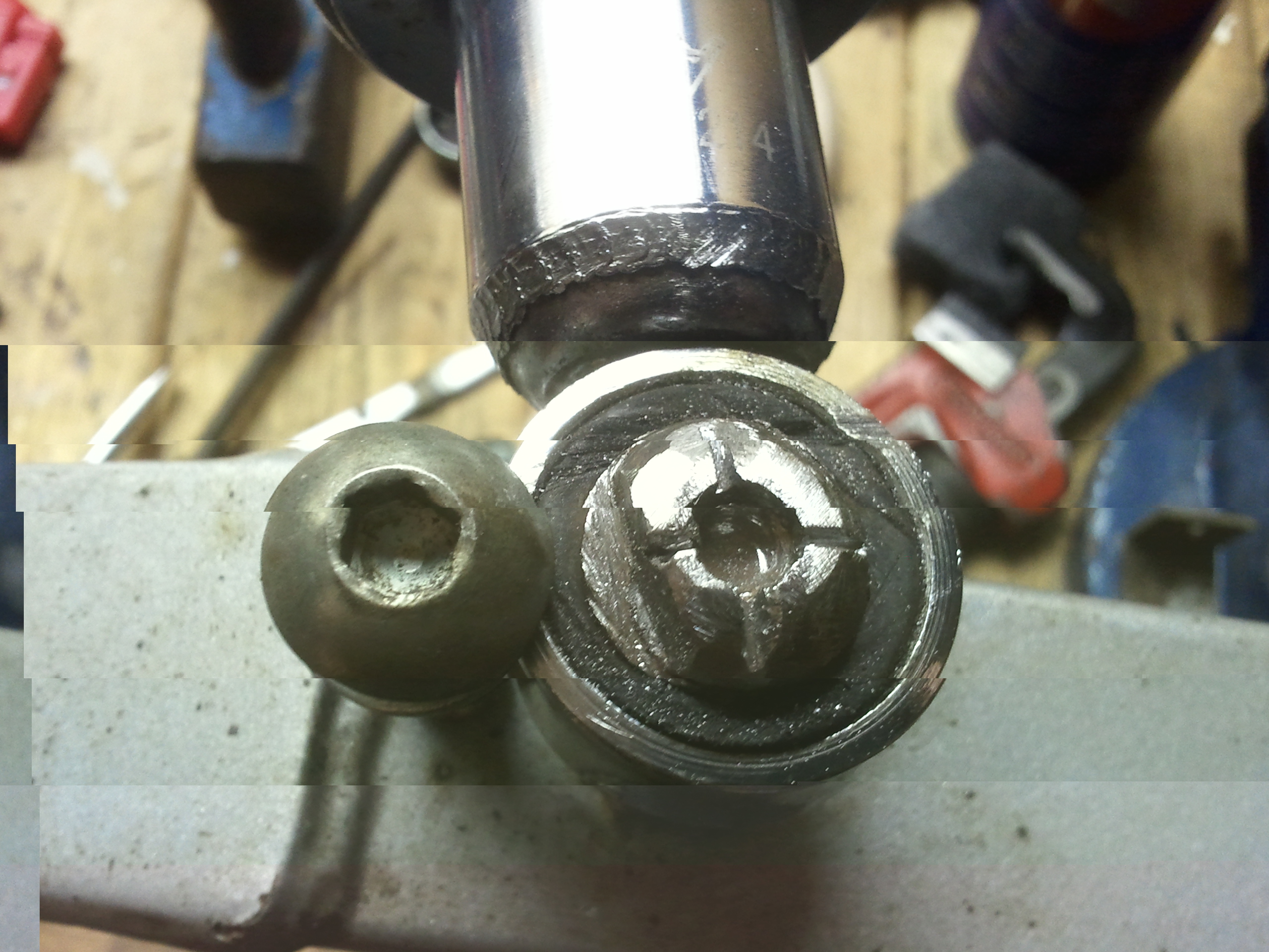 Hier foto's van die **bout die er niet uit wilde. Uiteindelijk op mijn werk laten en heb er een plaatwerker even flink zijn best op laten doen, met slijpen, beitelen en veel geweld ging die eruit.