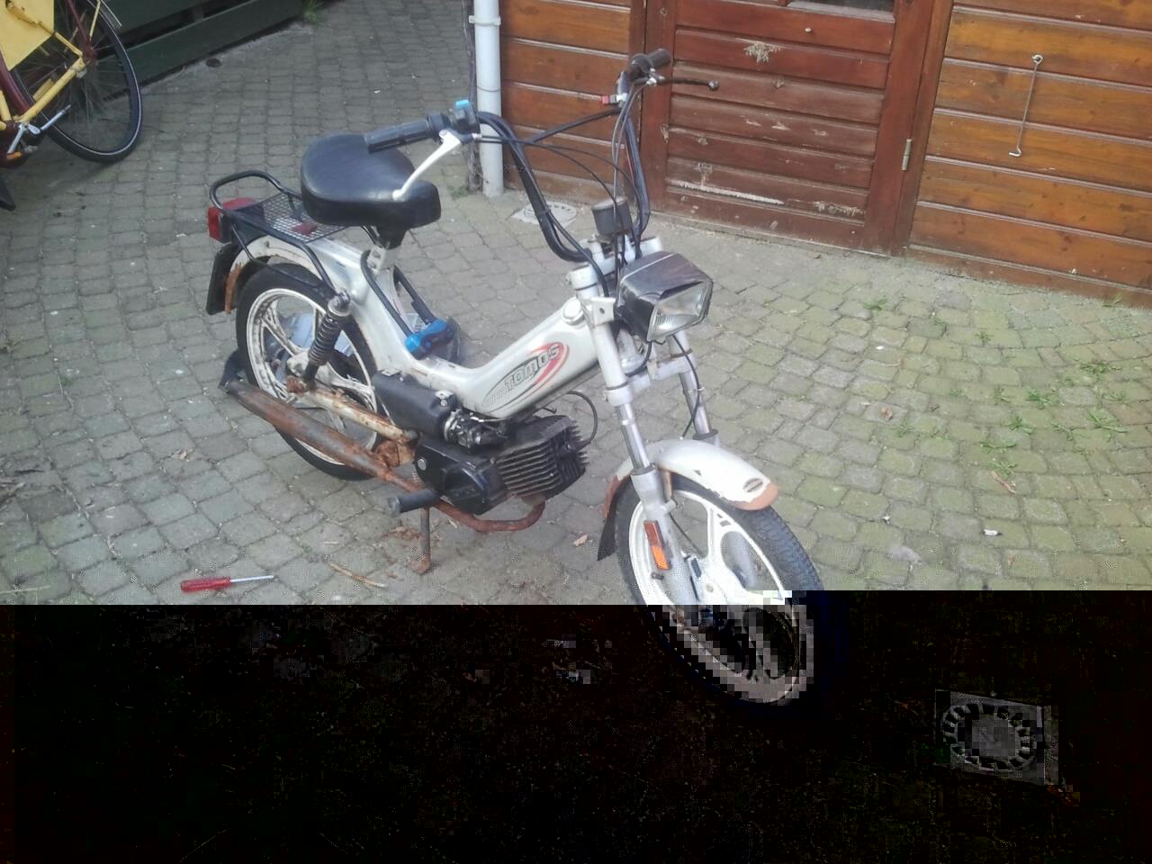 Dit is een foto van toen ik hem gekocht had. Inmiddels heb ik het voorspatbord, bagagedrager, en plaatje tussen het voorvork bewerkt in het zwart. Nu ben ik met het achterspatbord bezig. Nog volop te doen dus :mrgreen: