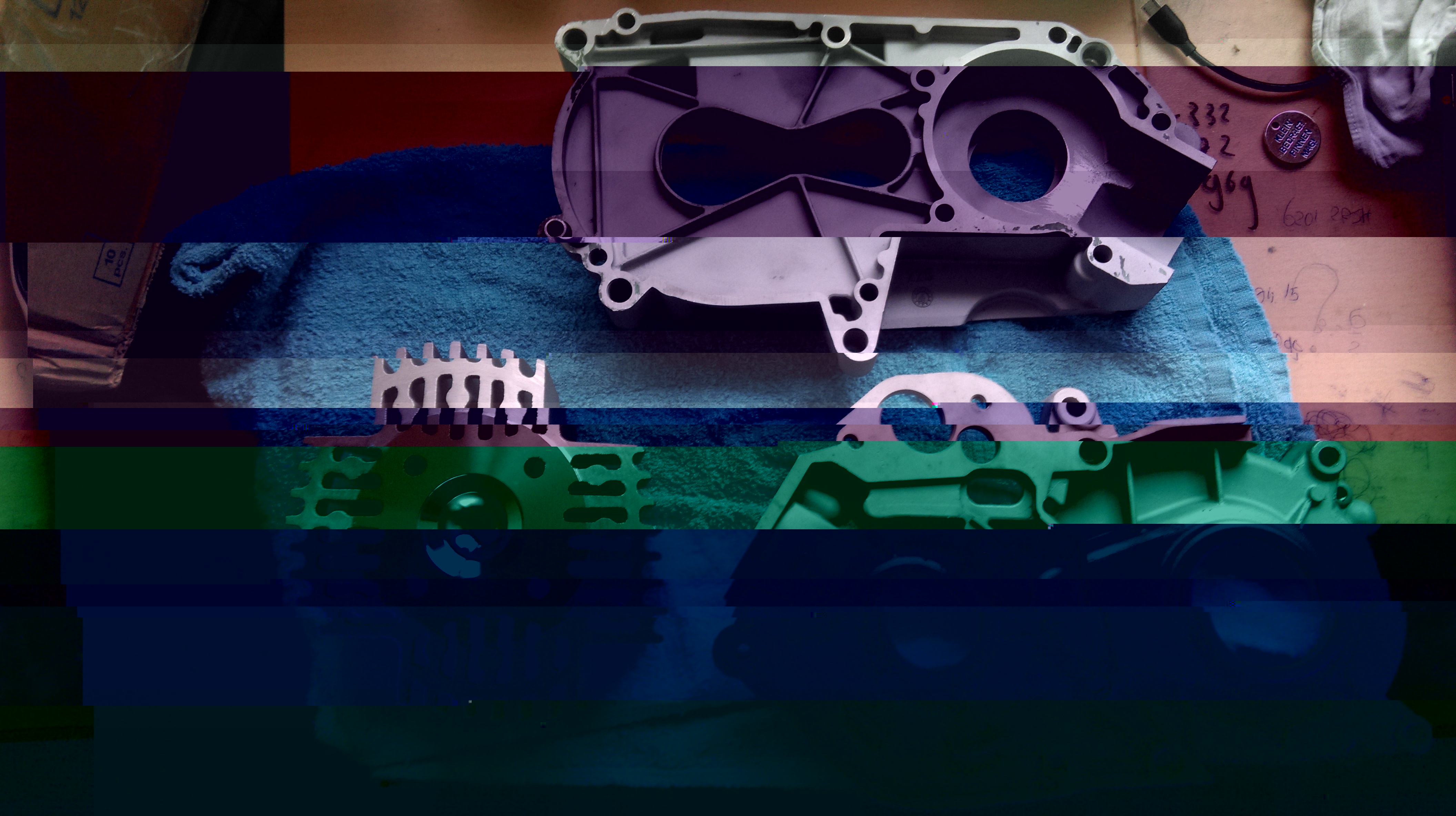 De carterdelen al terug, ziet er weer gelikt uit. Alle gietpuntjes en rafels in het carter gladgeschuurd met hele lichte korrel, nu ze open liggen is het die tien minuten werk wel waard. Heb ik straks weer een blokje onder mijn kont waarvan ik zeker ben dat alles goed is.