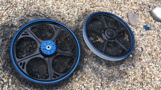 ook de velgen netjes gespoten met een blauw biesje en blauw tandwiel: