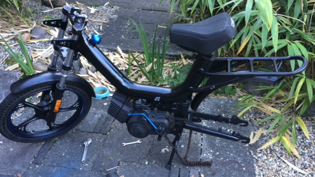 Heb hem na de aankoop helemaal uit elkaar gehaald en goed schoongemaakt. Her en der was er wel wat roest aanwezig dus ik heb alles netjes opgeschuurd. Er zaten hier en daar nog wel wat plekjes roest, maar heb de hele brommer gespoten met Hammerite. Ik heb gekozen voor de combinatie zwart met lichtblauw. Hierbij zwart als basiskleur en maar enkele details met blauw.