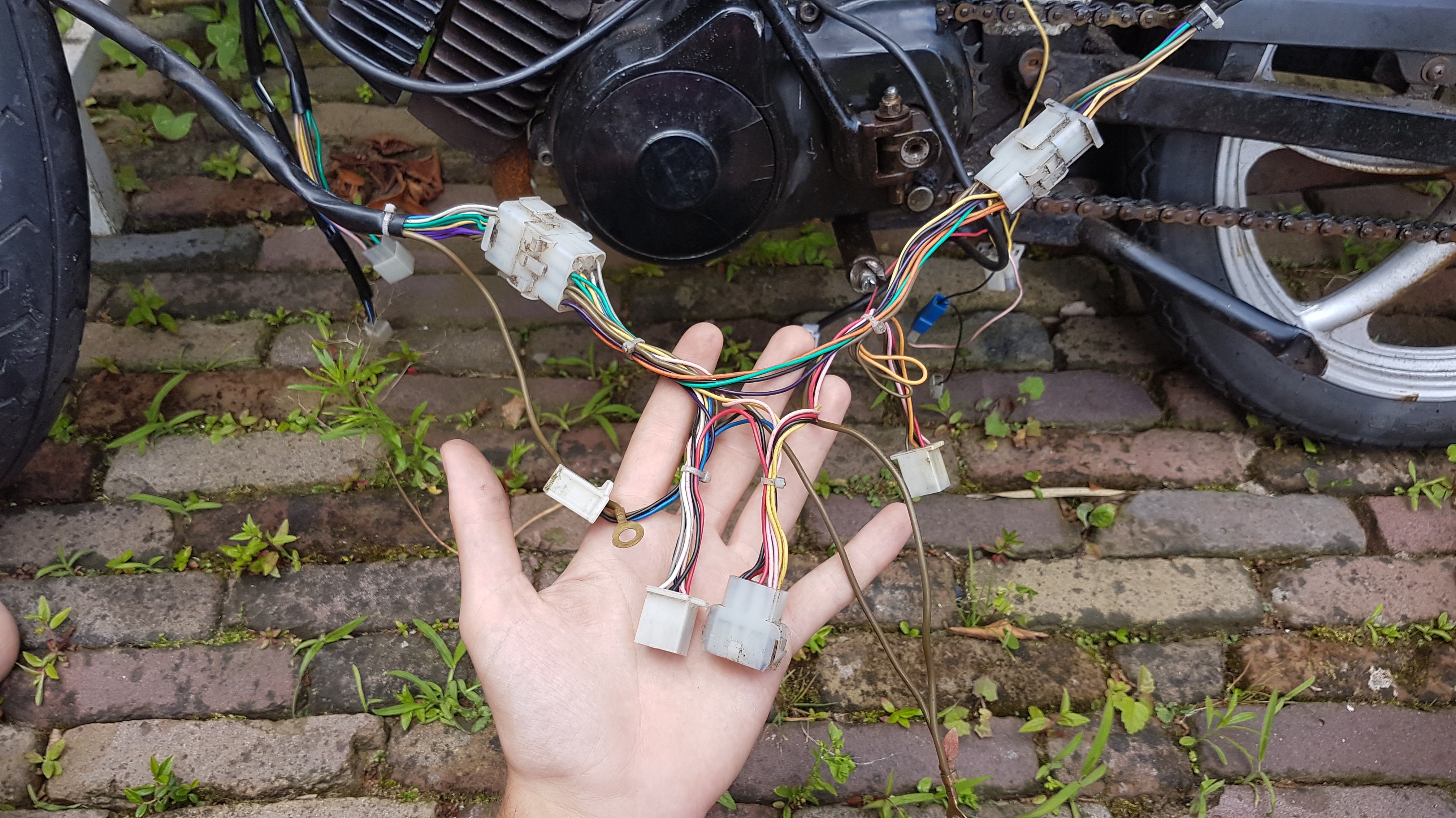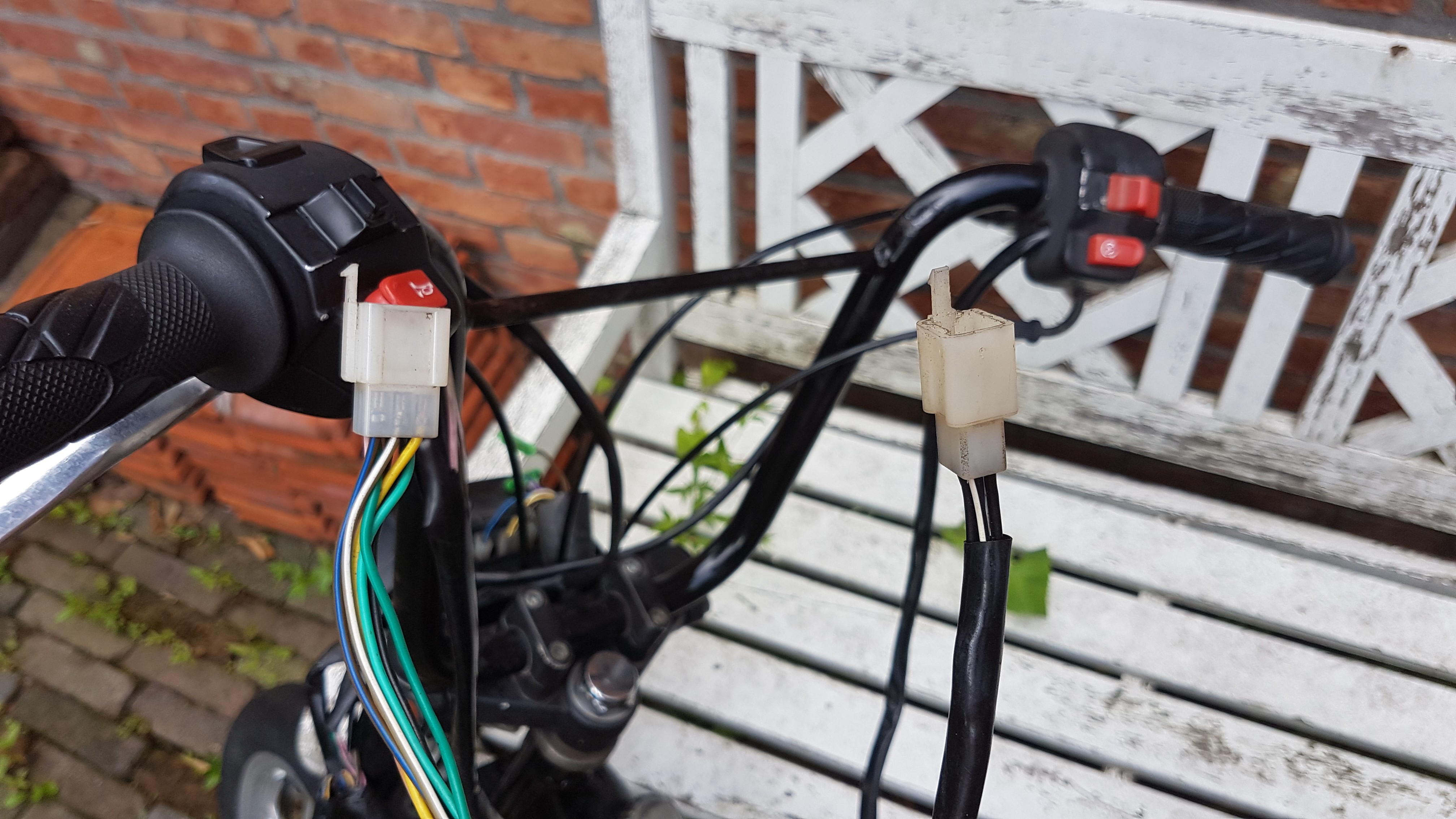 Deze kabels kreeg ik er los bij, ik heb al twee connectoren aan kunnen sluiten m.b.v de kleuren. De een gaat richting het stuur en de ander naar het achterlicht.