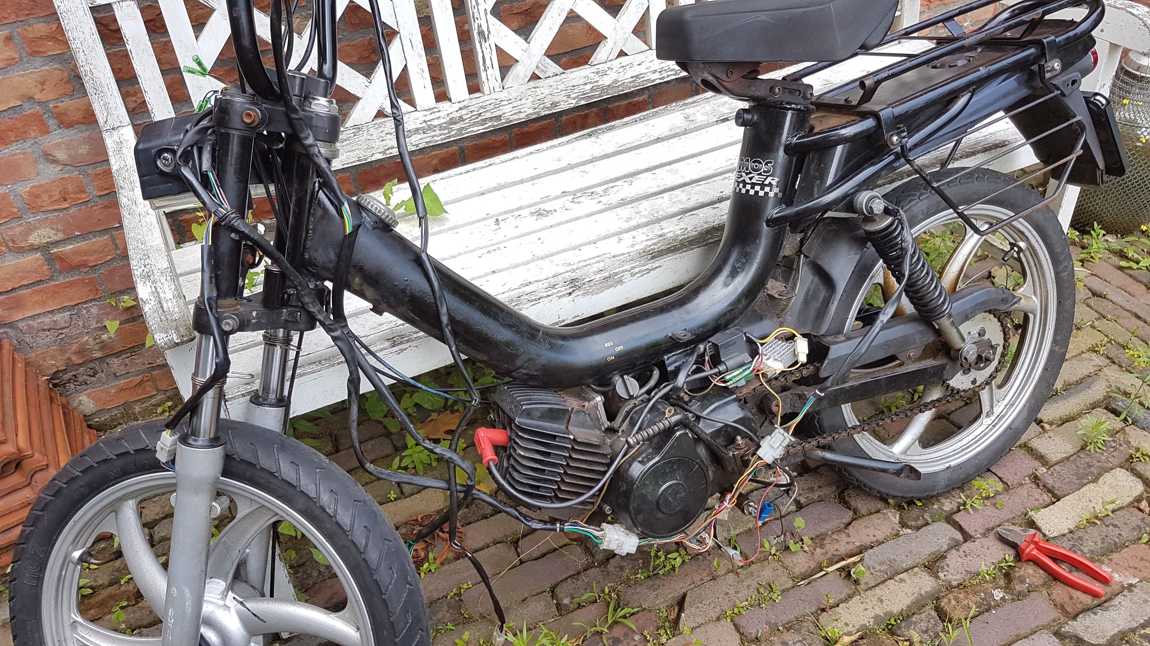 Het gaat om een snor Tomos Flexer XL uit 2010. Ik heb een aantal foto's gemaakt om een beetje een beeld te geven hoe de draden spaghetti eruit ziet, hopelijk kan iemand mij een beetje op weg helpen.