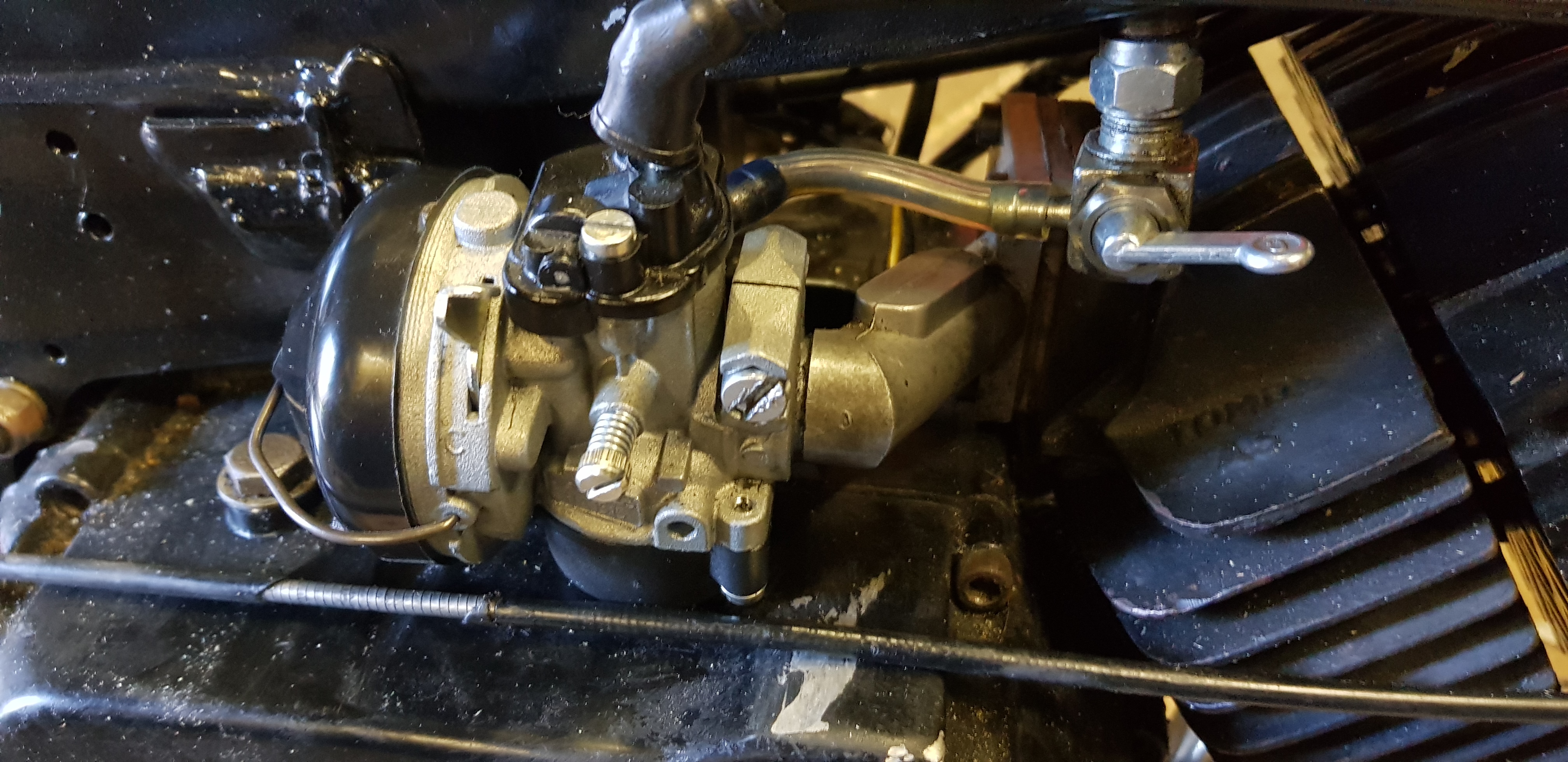 Met aan bedoel ik goed aangeschoven tegen de sesl in de carburateur achter de vulbus of dat de vulbus de spleet naast de bevestigingsschroef goed afsluit (eerst de bus goed erin drukken). Als er ook maar een kleine opening blijft waar lucht ksn worden aangezogen wil de motor niet of moeilijker draaien en heb je vermogenverlies. Gewoon ff checken dus. Visueel kan ik dit van de foto niet zien.