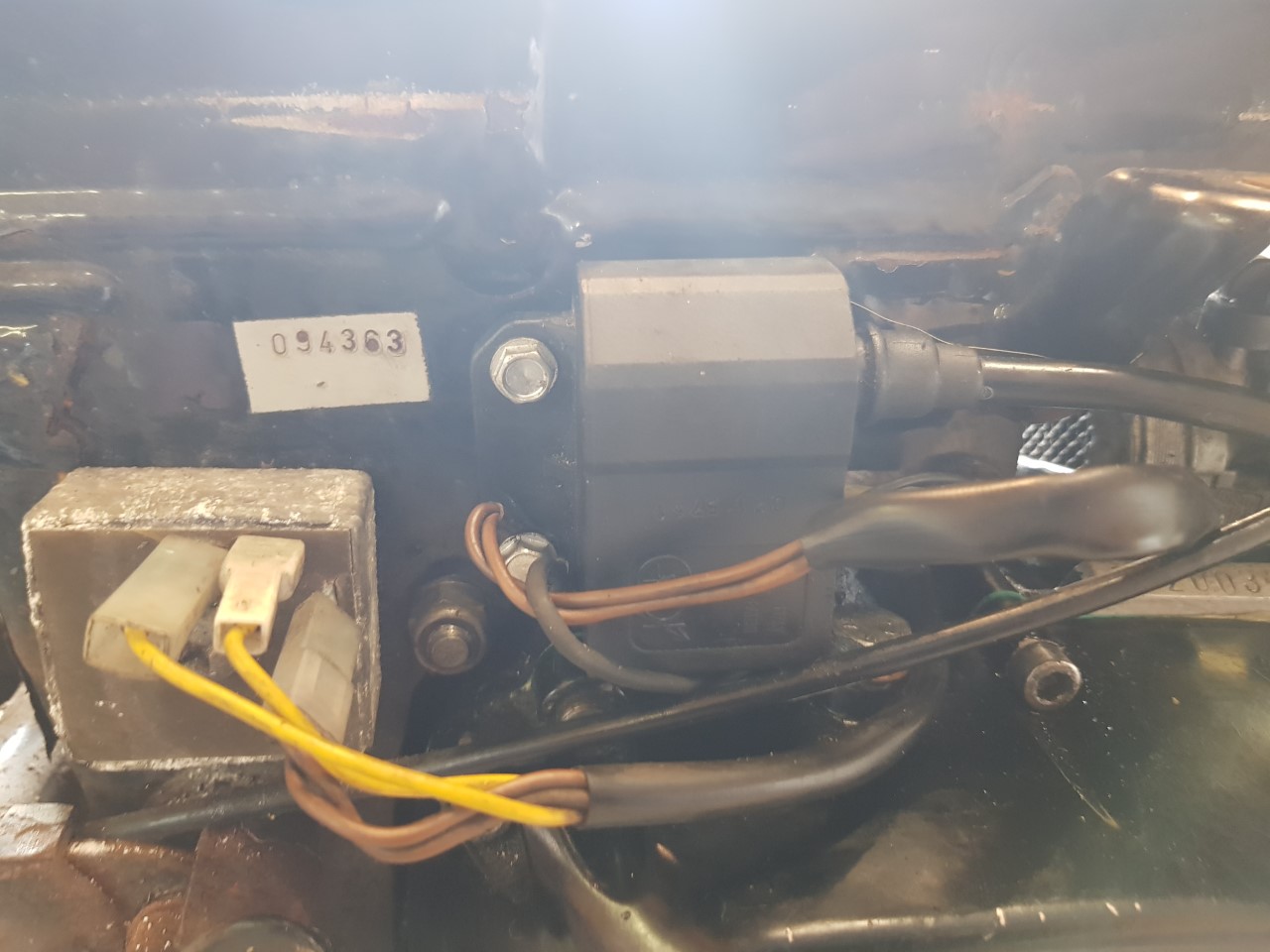 De ontsteking met contact punten en bobine aan het frame