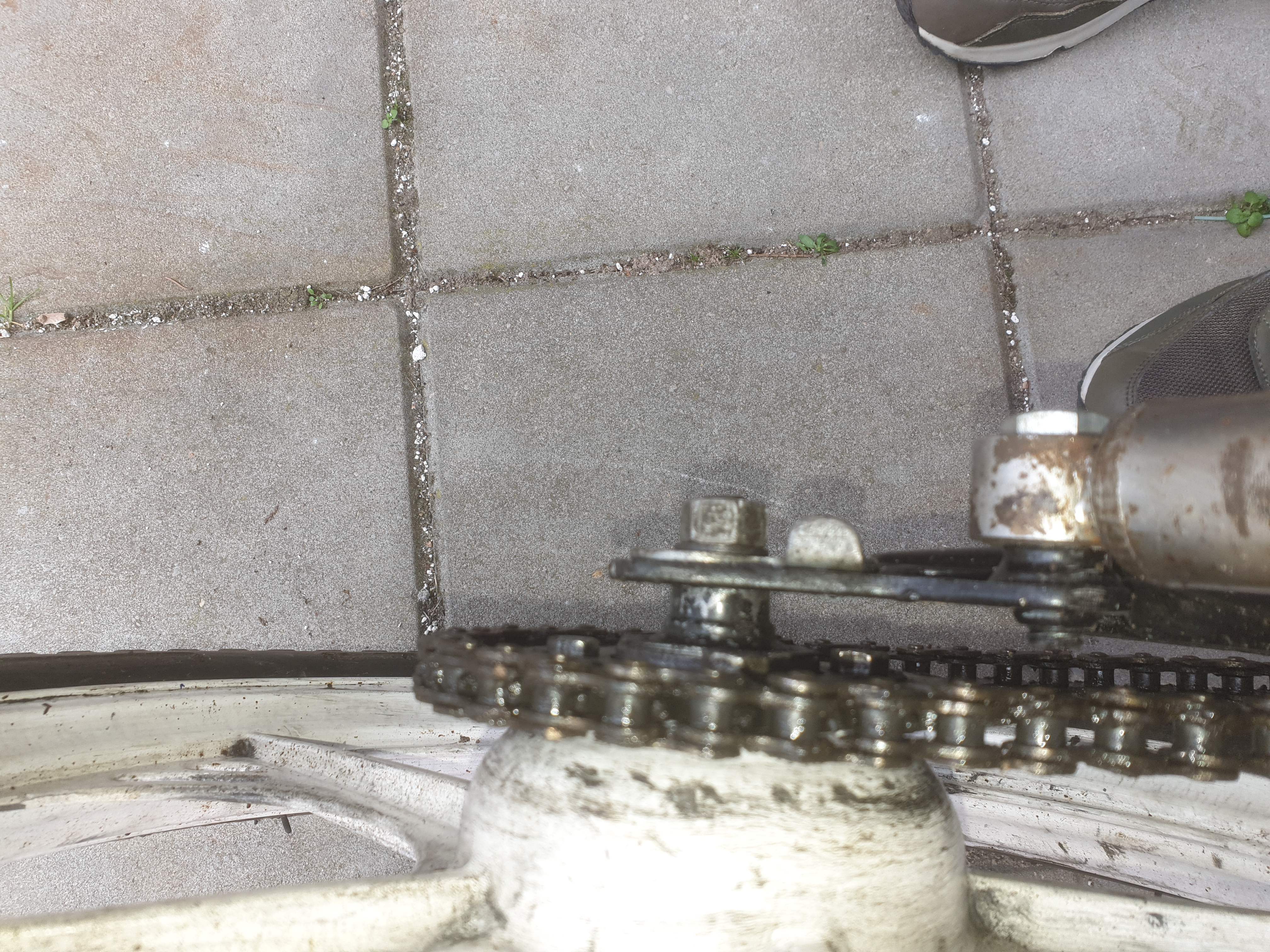 Ik heb wat foto's bijgevoegd, hoop dat ze een beetje duidelijk zijn. De ketting ligt recht ( moet nog wel gespannen worden eigenlijk). Frame lijkt niet gebogen en alles ziet er uit alsof het er goed in ligt.