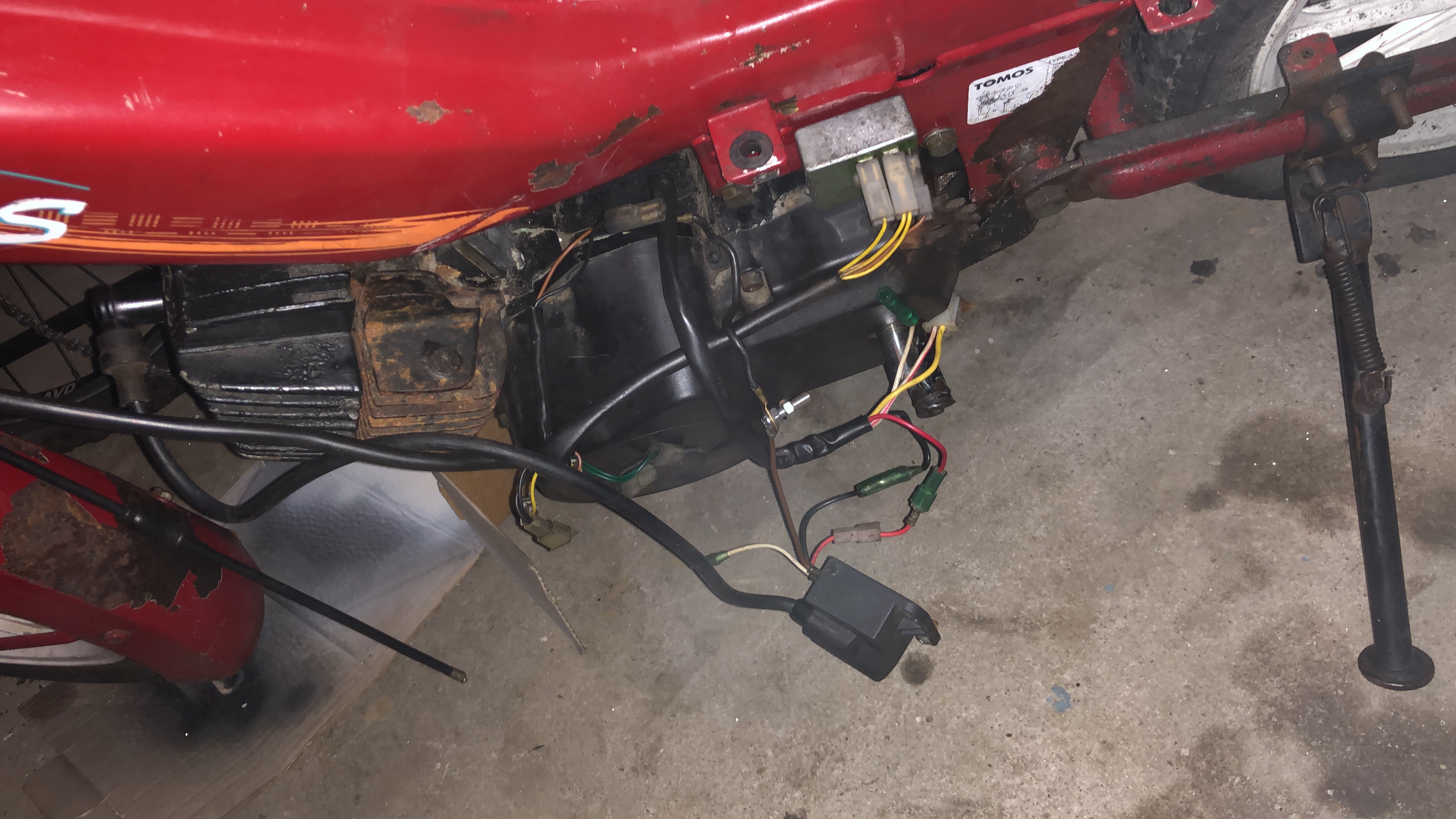 Top! Connector van de gele en rood-witte kabel afgeknipt, daarna de rood-witte kabel afgeplakt, een kabelschoentje op de gele gezet en aangesloten op de kabelboom. Daarba de rode kabels van de bobine aangesloten op de stopknop. Hij loopt meteen en de verlichting doet het, erg bedankt!