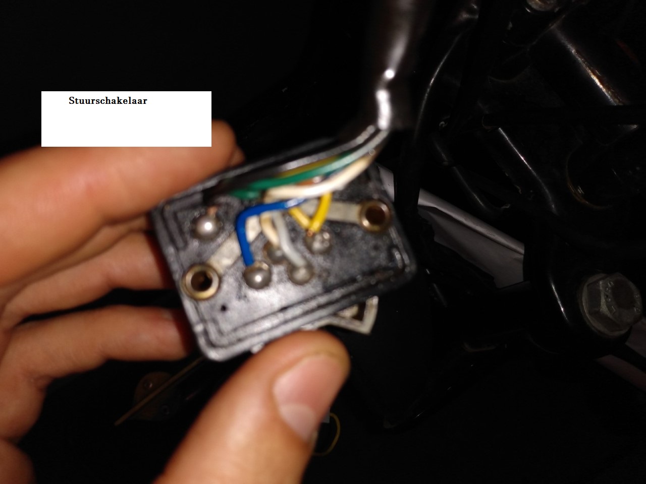 is het een idee de groene en gele die naar de remhendels lopen op elkaar aan te sluiten ? dan zou de stuurschakelaar weer stroom krijgen (vermoed nu niet) en dan zou remlicht iig in een stroomkring zitten.