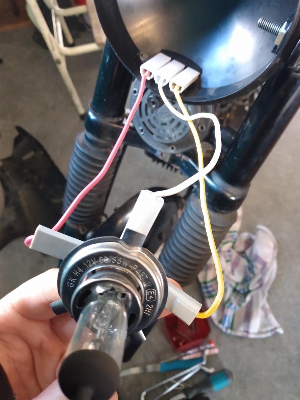 Waar openingen tussen draden zijn, ben ik niet helemaal zeker (ivm verkleuring draden), maar ik vermoed dat de witte van achterlicht op koplamp zit. De gele spanning zit denk ik op de koplamp, aangezien dat de enige is die het doet. Dat laat dat de overige massa naar de toeter zou moeten lopen.