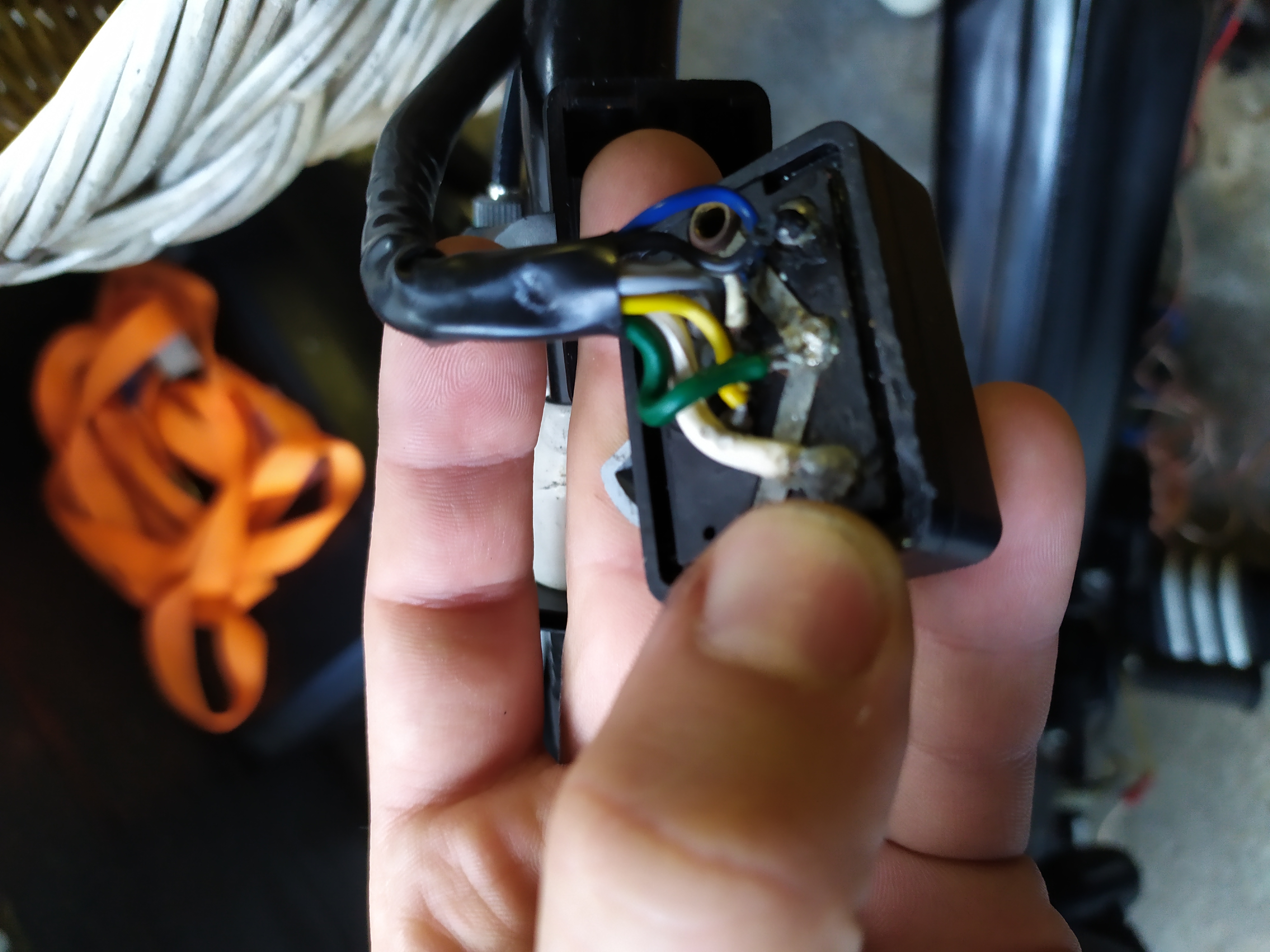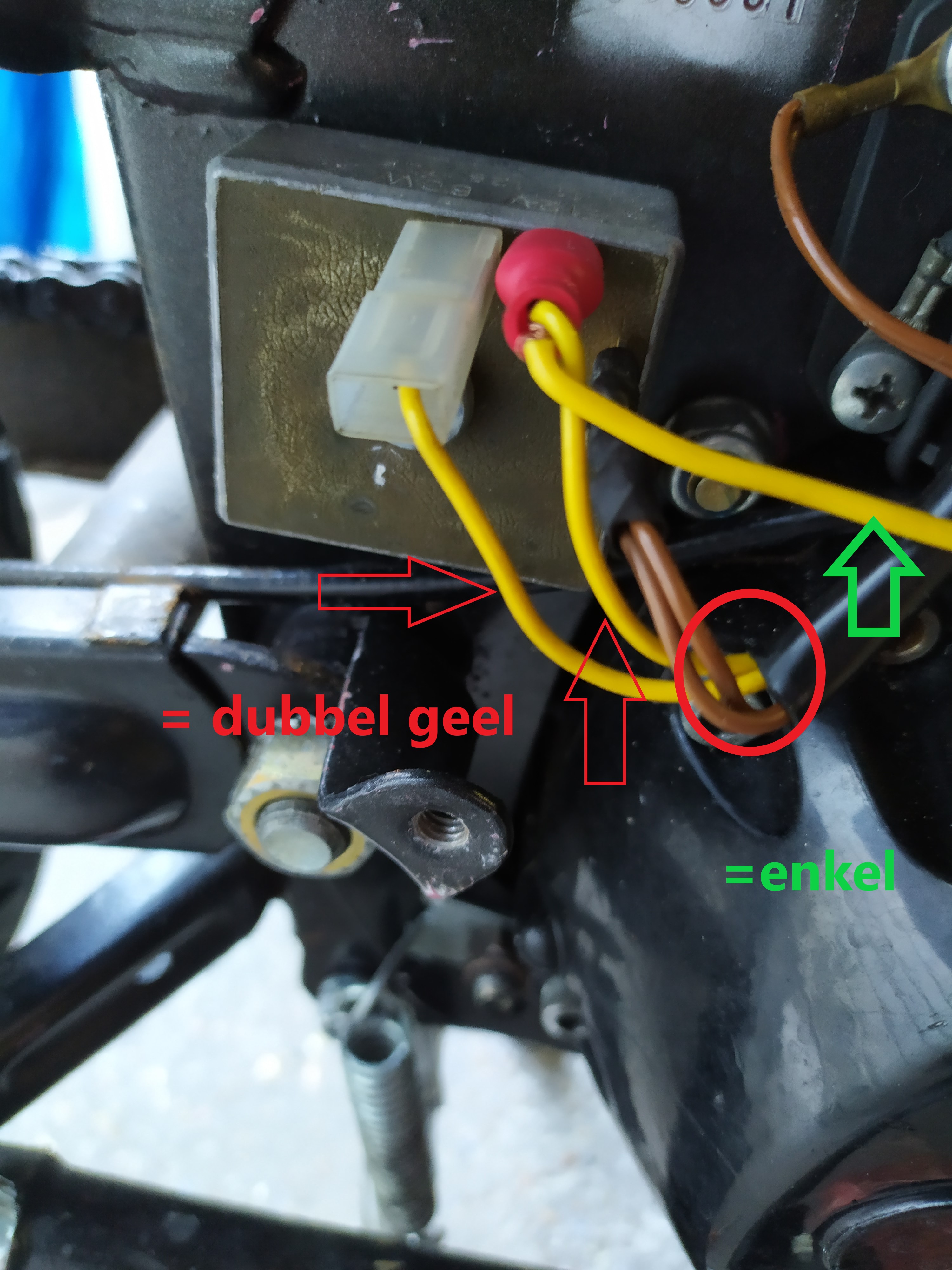Nou dat is wat ik dacht tot ik even naar oude foto's keek voordat ik um bespoten had en daar zaten maar echt 2 gele draden aan die 3e had ik zelf erop aangesloten voor de claxon.