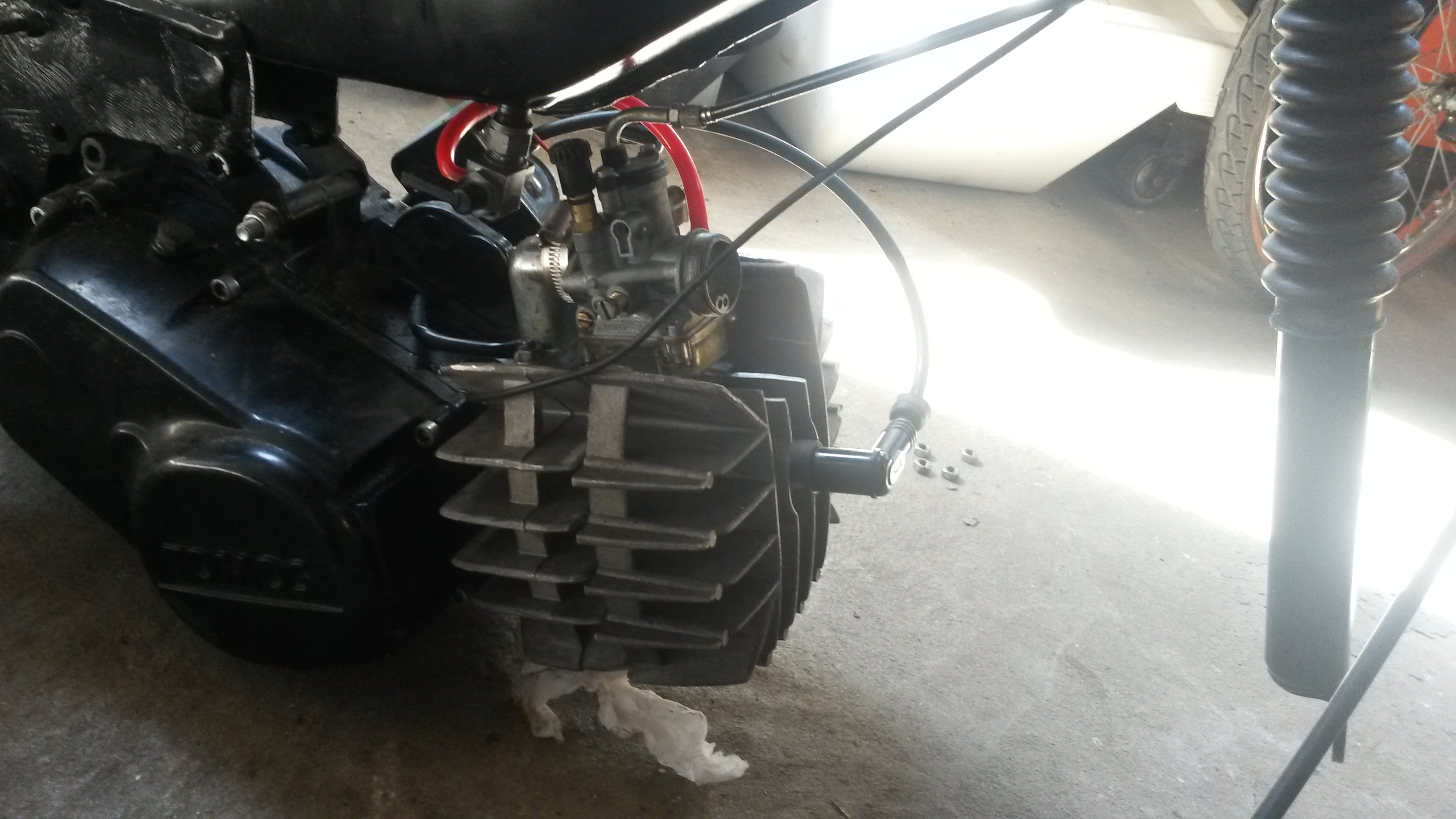 hehe eindelijk! carburateur merk is toch dellorto? tapeind m8 kan prima! zelf eergisteren nog gedaan voor m'n boot project gebeuren. je moet alleen ff de gaten in de cilinder iets groter boren en in de cikinderkop. zorg idd dat alles echt goed vast zit! ook je voorwiel goed vast zetten :lol: